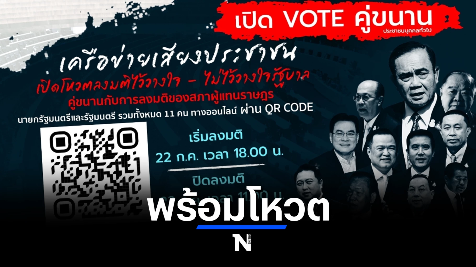 เพียงสแกนคิวอาร์โค้ดที่ขึ้นบนหน้าจอทีวี หรือคลิกลิงค์นี้ https://peoplevoiceth.survey.fm/เสียงประชาชนลงมติ-ไว้วางใจ-ไม่ไว้วางใจ-รัฐบาล ก็สามารถร่วมลงมติไว้วางใจหรือไม่ไว้ใจนายกรัฐมนตรีและรัฐมนตรีทั้ง 11 คน ได้ทันที!