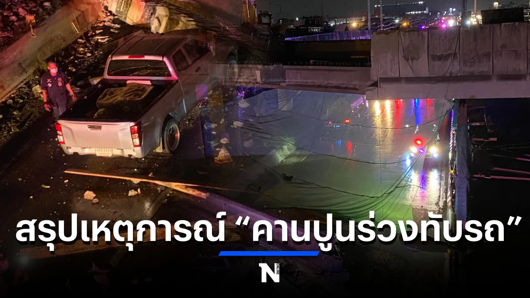 ทั้งนี้ นายณรงค์ รักร้อย ผวจ.สมุทรสาคร นายสุรศักดิ์ ผลยังส่ง รอง ผวจ.สมุทรสาคร พ.ต.อ.ยงลิต ศุภผล รักษาราชการแทน ผกก.สภ.เมืองสมุทรสาคร และเจ้าหน้าที่หน่วยงานที่เกี่ยวข้องร่วมตรวจสอบที่เกิดเหตุ รถเก๋งเชฟโรเลต ทะเบียน ชธ 6271 กทม. ถูกแผ่นปูนความยาวกว่า 10 เมตร น้ำหนักประมาณ 5 ตัน หล่นลงมาทับทั้งคันจนรถขาดบี้แบนคนที่นั่งเบาะซ้ายเสียชีวิตคาซาก ส่วนคนขับได้รับบาดเจ็บ และกระบะอีซูซุ ทะเบียน 3 ฒธ 5940 กทม. ด้านหน้ารถถูกแผ่นปูนทับ โชคดีคนขับและผู้โดยสารปลอดภัย โดยเหตุการณ์ครั้งนี้เบื้องต้น มีผู้เสียชีวิต 1 ราย (รถยนต์เก๋ง) และมี พนง.เสียชีวิตที่ รพ.สมุทรสาครอีก 1 ราย และเสียชีวิตในเวลาต่อมา ได้รับบาดเจ็บประมาณ 2 ราย