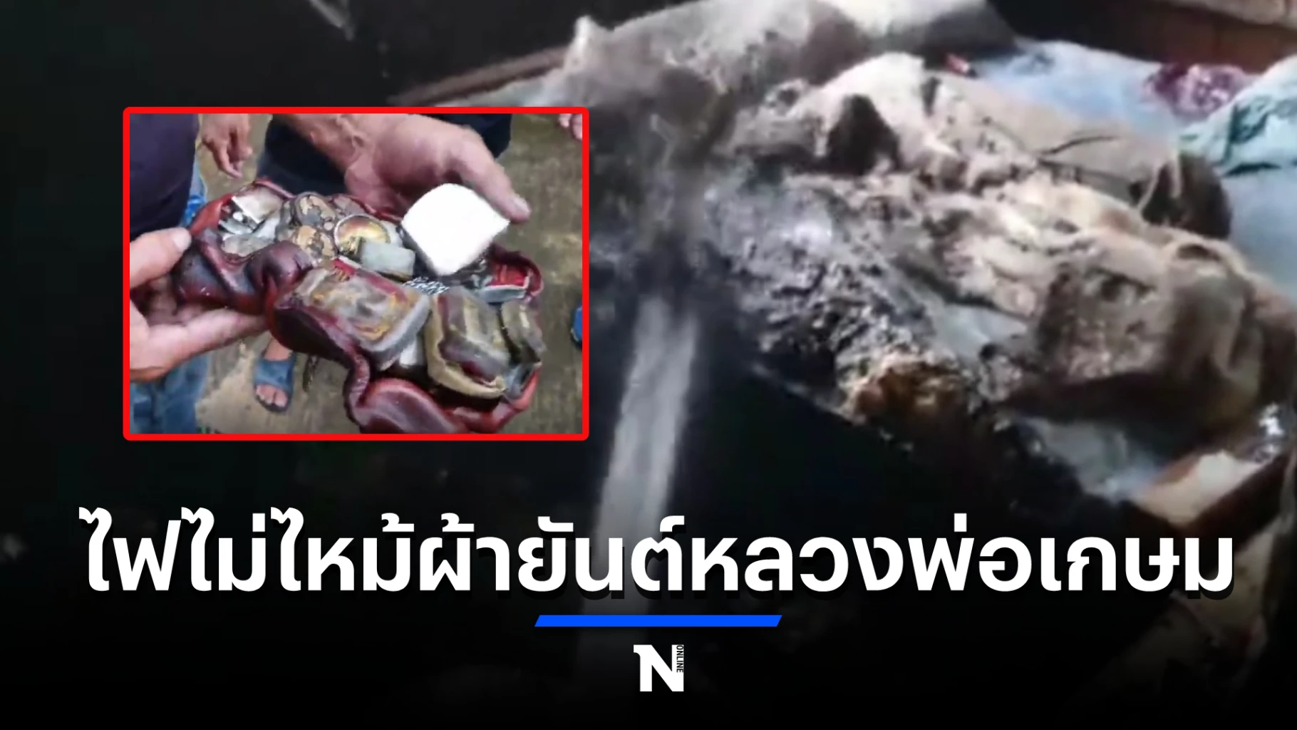 เจ้าของบ้าน กล่าวว่า ขณะไฟไหม้บ้านตนเองไม่อยู่บ้านปิดบ้านไว้ไปทำงานส่งน้ำแข็ง รู้ว่าไฟไหม้เพราะหลานโทรมาบอกจึงรีบกลับมาบ้าน และพบว่าในห้องนอนของตนเองถูกไฟไหม้เสียหายทั้งหมด และพบว่าพระเครื่อง เครื่องรางของขลัง ที่เก็บไว้บนหัวเตียงและผ้ายันต์หลวงพ่อเกษม เขมโก ที่พับเก็บไว้ ไฟไม่ได้ไหม้แต่อย่างใด
