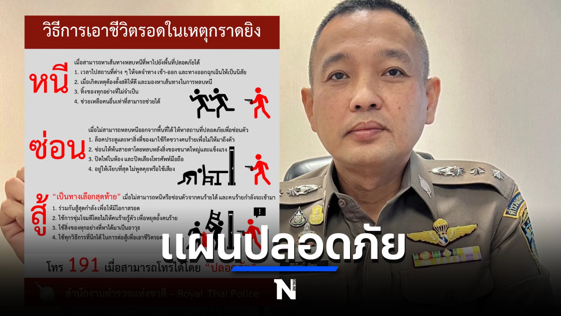 สำนักงานตำรวจแห่งชาติ จึงขอประชาสัมพันธ์ให้ประชาชนได้รู้จักหลัก “หนี ซ่อน สู้” หรือ “Run Hide Fight” ซึ่งเป็นหลักสากลที่ FBI และหน่วยงานบังคับใช้กฎหมายในหลายๆ ประเทศ นำมาใช้แนะนำประชาชนในการเอาชีวิตรอดในเหตุกราดยิง โดยหลักการดังกล่าวมีรายละเอียดดังนี้