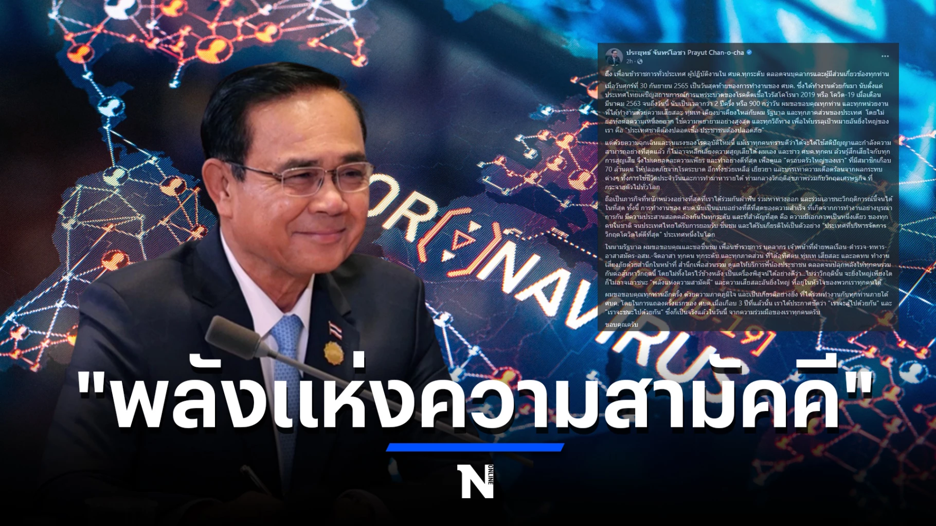 เมื่อวันศุกร์ที่ 30 กันยายน 2565 เป็นวันสุดท้ายของการทำงานของ ศบค. ซึ่งได้ทำงานด้วยกันมา นับตั้งแต่ ประเทศไทย เผชิญสถานการณ์การแพร่ระบาดของโรคติดเชื้อไวรัสโคโรนา 2019 หรือ โควิด-19 เมื่อเดือนมีนาคม 2563 จนถึงวันนี้ นับเป็นเวลากว่า 2 ปีครึ่ง หรือ 900 กว่าวัน ผมขอขอบคุณทุกท่าน และทุกหน่วยงาน ที่ได้ทำงานด้วยความเสียสละ ทุ่มเท เคียงบ่าเคียงไหล่กับผม รัฐบาล และทุกภาคส่วนของประเทศ โดยไม่ย่อท้อต่อความเหนื่อยยาก ใช้ความพยายามอย่างสูงสุด และทุกวิถีทาง เพื่อให้บรรลุเป้าหมายอันยิ่งใหญ่ของเรา คือ "ประเทศชาติต้องปลอดเชื้อ ประชาชนต้องปลอดภัย"