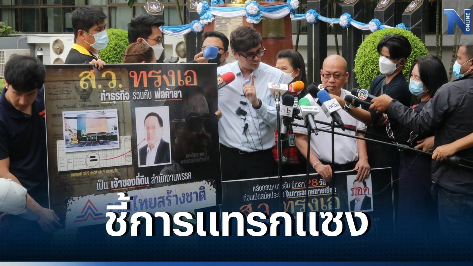 นอกจากนี้ นำป้ายหาเสียง 2 แผ่นมาแสดงพร้อมกล่าวว่า วันนี้ที่ตนนำมามี 2 ป้าย ระบุข้อความว่า นักการเมืองขายยาจะหมดไปได้ด้วยก้าวไกลเป็นรัฐบาล ทั้งนี้ ตนไม่ได้ตั้งใจจะมาหาเสียงแต่ที่นำมา 2 ป้ายนี้ก็เพื่อจะมาติดที่หน่วยงานและหวังว่าเนื้อหาดังกล่าวจะสามารถใช้ป้ายนี้เป็นป้ายเตือนใจว่าจะทำคดีเรื่องนี้ให้อย่างดีที่สุด