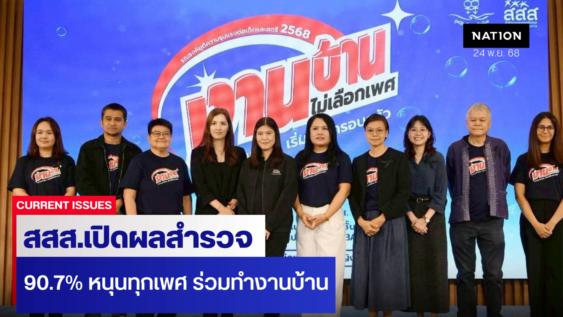 ขณะที่ คุณลลนา ก้องธรนินทร์ หรือ “หมอเจี๊ยบ” ดารานักแสดง กล่าวว่า ตอนเด็ก คุณพ่อ คุณแม่ให้ตนช่วยงานบ้านเท่าที่อายุทำไหว เช่น เก็บที่นอน ล้างจาน กวาดบ้าน ซึ่งท่านไม่ได้กดดันให้ทำ แต่เน้นสอนเรื่องความความรับผิดชอบกับระเบียบเรียบร้อยมากกว่า ทำให้โตขึ้นรู้สึกว่างานบ้านเป็นทักษะพื้นฐานที่ทุกคนควรรู้ ไม่ได้เกี่ยวกับว่าเป็นผู้หญิงหรือผู้ชาย ดังนั้นตนคิดว่า การทำงานบ้านเป็นกิจกรรมที่ช่วยฝึกทั้งวินัย การจัดการเวลา และความรับผิดชอบ แถมบ้านที่สะอาดและเป็นระเบียบยังช่วยให้ใจเราสงบขึ้น อยู่แล้วไม่วุ่นวาย รู้สึกปลอดภัยขึ้น และทำให้คนในบ้านช่วยกันดูแลเหมือนเป็นทีมเดียวกัน ดังนั้น อยากให้ทุกคน ทุกเพศ มองการทำงานบ้านเป็นทักษะชีวิตที่ทุกคนควรรู้ ไม่ใช่เรื่องของเพศ เริ่มจากเปิดโอกาสให้เด็กๆ ได้ฝึกตามวัย กล่าวชื่นชมเขาเวลาทำได้ดี และแบ่งหน้าที่กันอย่างยุติธรรม จะช่วยให้บรรยากาศในบ้านอบอุ่นขึ้น และเด็กจะโตไปเป็นผู้ใหญ่ที่ดูแลตัวเองได้ดี