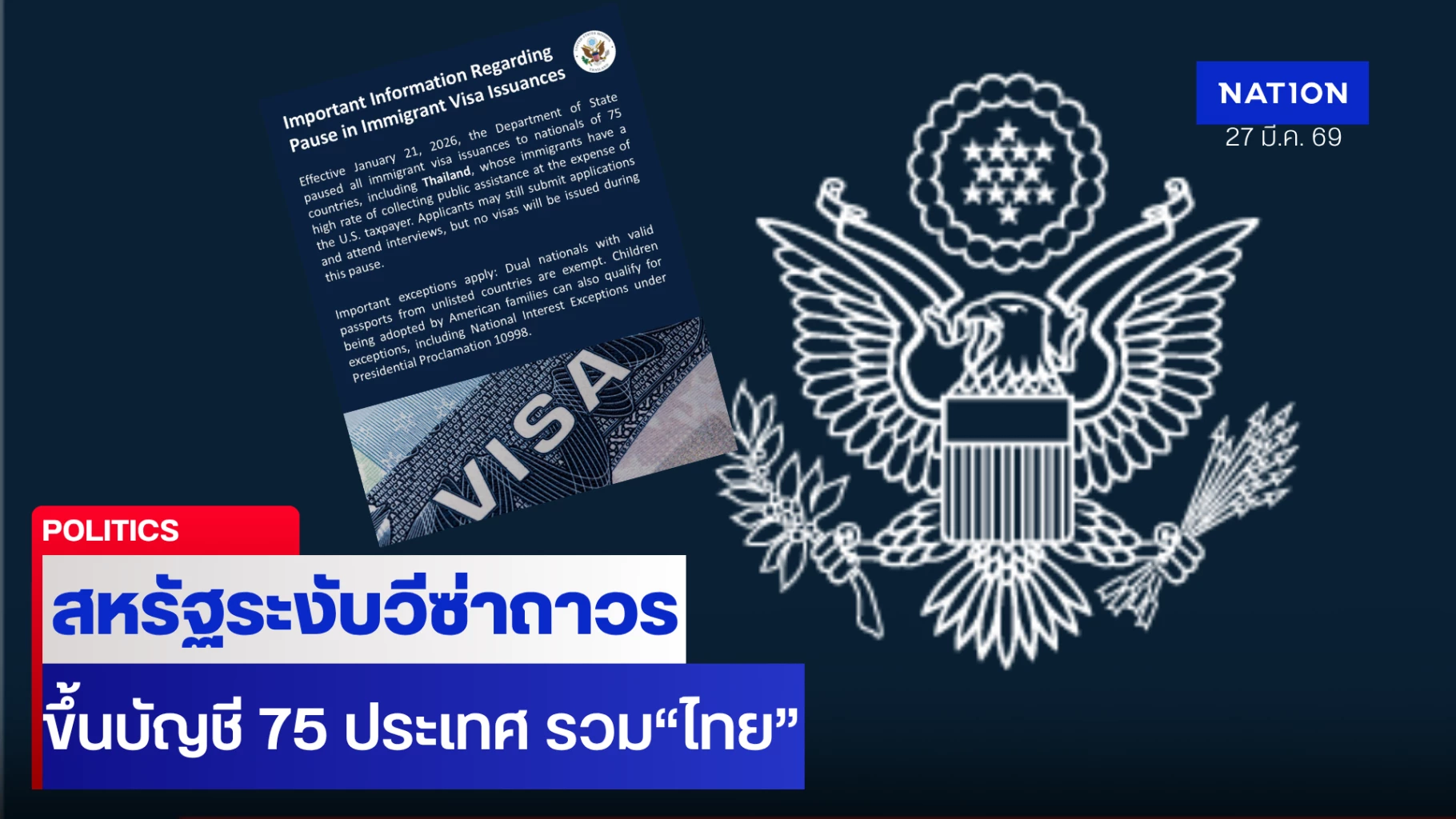27 มี.ค.69 สถานเอกอัครราชทูตสหรัฐประจำประเทศไทย ออกเอกสารข่าวระบุว่า ตั้งแต่วันที่ 21 มกราคม 2569 เป็นต้นไป กระทรวงการต่างประเทศสหรัฐฯ จะระงับการออกวีซ่าถาวรทั้งหมดให้แก่ผู้ที่มีสัญชาติจาก 75 ประเทศ รวมถึง ประเทศไทย ซึ่งกลุ่มผู้อพยพจากประเทศดังกล่าวมีอัตราการรับสวัสดิการสาธารณะในระดับสูง อันก่อให้เกิดภาระค่าใช้จ่ายต่อผู้เสียภาษีของสหรัฐฯ ผู้สมัครวีซ่าถาวรซึ่งเป็นผู้มีสัญชาติจากประเทศที่ได้รับผลกระทบ ยังสามารถยื่นคำร้องขอวีซ่าและเข้ารับการสัมภาษณ์ได้ตามปกติ แต่จะไม่มีการออกวีซ่าถาวรให้แก่ผู้มีสัญชาติจากประเทศเหล่านี้ในช่วงระยะเวลาที่มีการระงับดังกล่าว