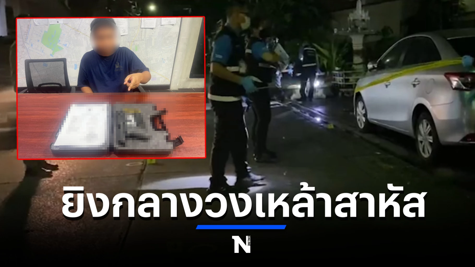 ที่เกิดเหตุเป็นอาคารตึกร้างสูง 5 ชั้น บริเวณถนนด้านหน้าพบรถยนต์ ยี่ห้อโตโยต้า วีออส สีเทา หมายเลขทะเบียน 5 กพ 7147 กทม สภาพกระจกด้านหน้ารถ และกระจกประตูด้านซ้าย มีรอยกระสุนปืนยิงรวม 2 รู แตกร้าวเสียหาย มีรอยหยดเลือดและปลอกกระสุนปืนขนาด 9 มม.รวม 3 ปลอกตกอยู่บริเวณหน้าตึกร้าง