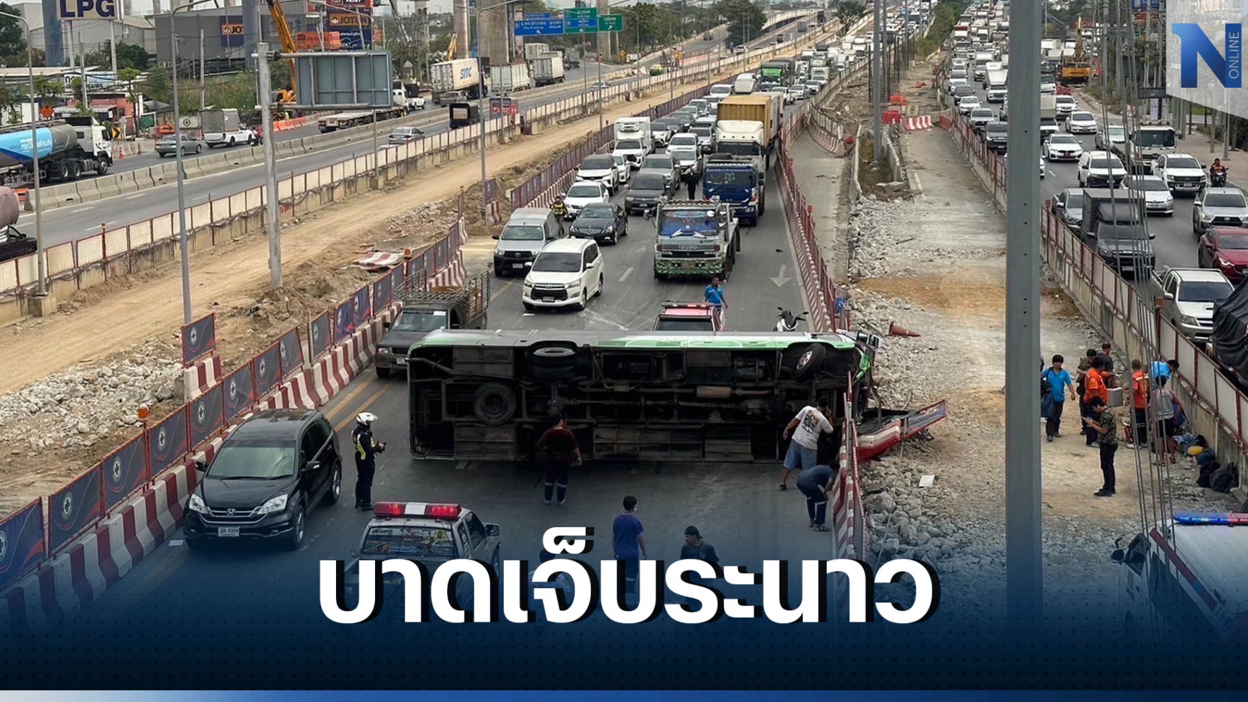 ที่เกิดเหตุพบรถมินิบัส 6 ล้อ ไม่ทราบยี่ห้อ สีเขียว ติดสัญลักษณ์ช่อง 7 HD พลิกคว่ำตะแคงขวาง ถ.พระราม 2 ในช่องทางด่วน ทั้ง 3 เลน ส่งผลให้การจราจรบนถนนพระราม 2 ขาออก มุ่งหน้ามหาชัย รถติดขัดท้ายแถวยาวจนถึงบางมด