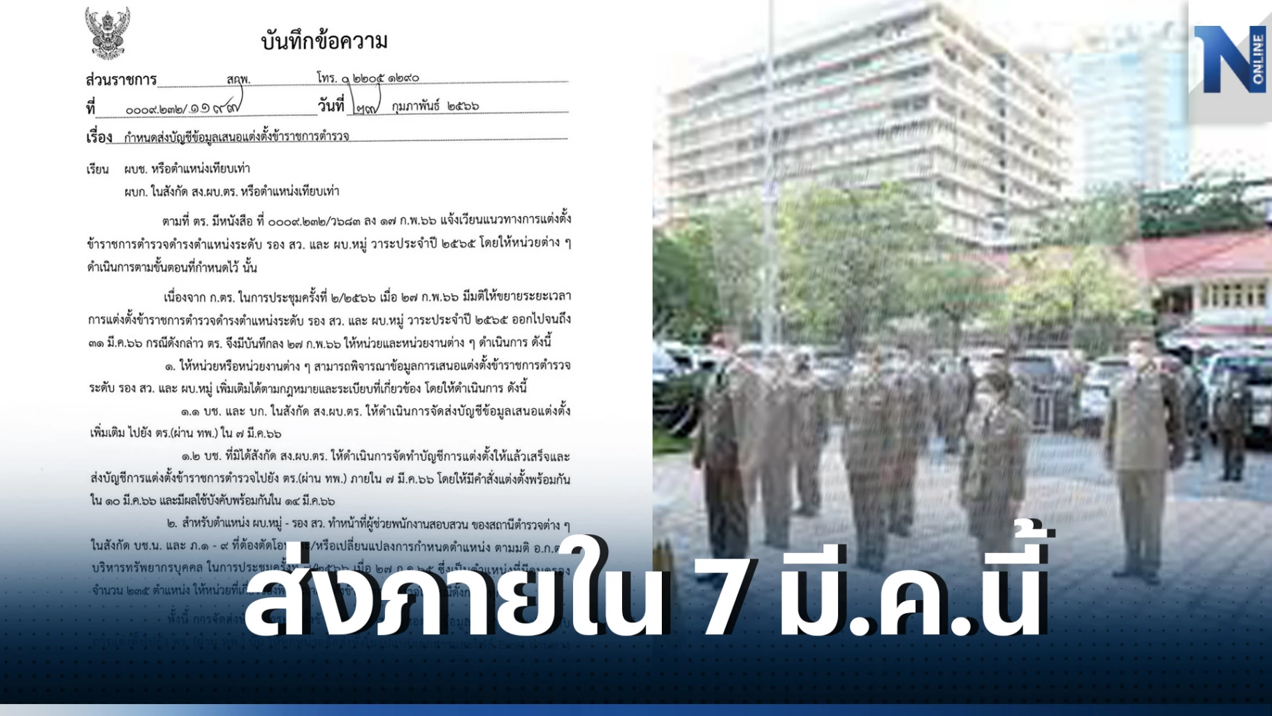 1.1 บช. และ บก. ในสังกัด สง.ผบ.ตร. ให้ดำเนินการจัดส่งบัญชีข้อมูลเสนอแต่งตั้ง เพิ่มเติม ไปยัง ตร. (ผ่าน ทพ.) ใน 7 มี.ค.66