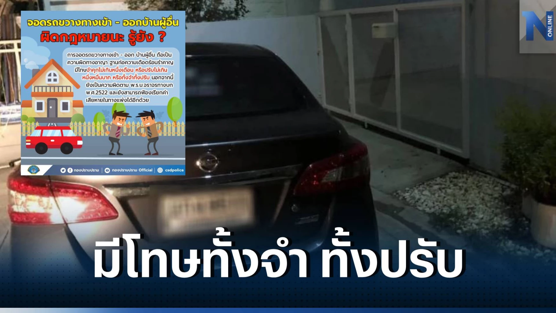 เกี่ยวกับเรื่องการจอดรถขวางทางเข้า-ออก บ้านผู้อื่นนั้น เฟซบุ๊ก กองปราบปราม ได้โพสต์รูปภาพและข้อความ ระบุว่า ปัญหาการจอดรถกีดขวาง หรือการจอดรถในที่ห้ามจอดเป็นถือเป็นปัญหาที่พบกันได้บ่อยครั้ง สำหรับบางท่านอาจเห็นว่าเป็นปัญหาเล็กน้อยที่สามารถเจรจาตกลงกันได้ แต่ก็มีอยู่ไม่น้อยเลยทีเดียวที่คู่กรณีไม่สามารถตกลงกันได้จนเกิดเป็นเหตุบานปลาย มีการทำลายทรัพย์สิน หรือถึงขั้นทำร้ายร่างกายกันตามที่เป็นข่าวกันก็มีมาแล้ว