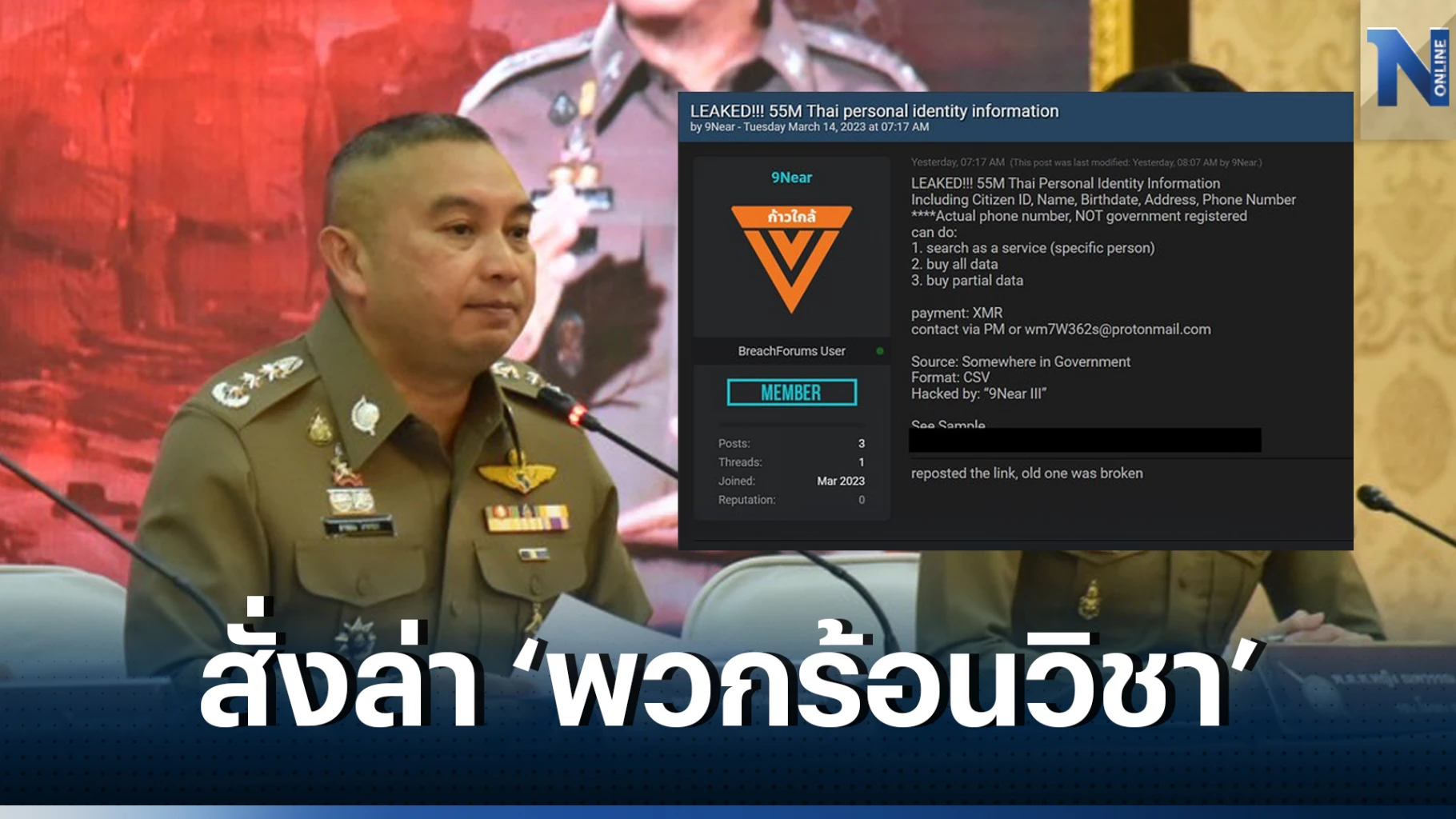 4 เมษายน 2566 พล.ต.ท.อาชยน ไกรทอง โฆษกสำนักงานตำวจแห่งชาติ (โฆษกตร.) เปิดเผยว่า พล.ต.อ.ดำรงศักดิ์ กิตติประภัสร์ ผู้บัญชาการตำรวจแห่งชาติ ได้สั่งการให้กองบัญชาการตำรวจสืบสวนสอบสวนอาชญากรรมทางเทคโนโลยี หรือตำรวจไซเบอร์ เร่งตรวจสอบผู้ใช้งานบัญชีที่ใช้ชื่อว่า “9near” โพสต์ขายข้อมูลส่วนตัวของคนไทยกว่า 55 ล้านรายการ บนเว็บไซต์ Bleach Forums โดยอ้างว่าได้มาจากหน่วยงานรัฐแห่งหนึ่งของประเทศไทย และได้โพสต์ตัวอย่างไฟล์ ระบุชื่อ สกุล ที่อยู่ วันเกิด เบอร์โทรศัพท์และเลขที่บัตรประจำตัวประชาชน พร้อมทั้งระบุข้อความข่มขู่ผู้เสียหายให้ติดต่อกลับ