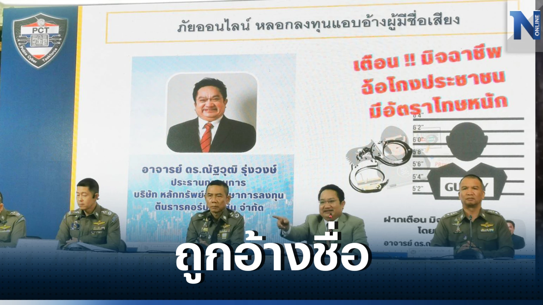 ด้าน พล.ต.ต.ชูศักดิ์ ขนาดนิด ผบก.ตอท.บช.สอท. กล่าวว่า สำหรับคดีออนไลน์ที่คนร้ายนำมาหลอกลวงซ้ำเติมประชาชนในช่วงนี้ คือ การแอบอ้าง อาจารย์ ดร.ณัฐวุฒิ รุ่งวงษ์ ประธานกรรมการ บริษัท หลักทรัพย์ที่ปรึกษาการลงทุน ต้นธารคอเปอร์เรชั่นจำกัด หลอกให้โอนเงินลงทุนซื้อหุ้นต่างประเทศ สูญเงิน 6 ล้าน