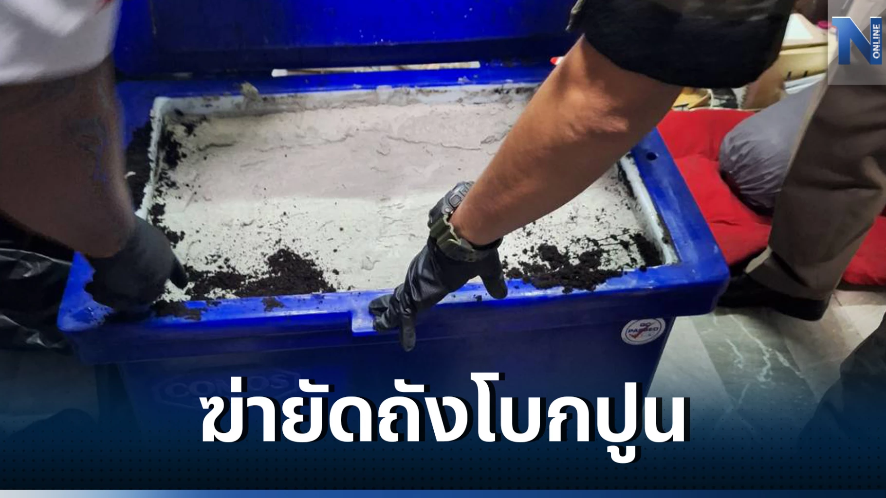 ที่เกิดเหตุมีลักษณะเป็นทาวเฮ้าส์ 2 ชั้น ประกอบกิจการรับจ้างแพ็คสินค้าใส่กล่องเพื่อส่งมอบให้บริษัทขนส่ง จากการตรวจสอบบริเวณครัวหลังบ้านชั้นล่าง พบถังพลาสติก ขนาด 200 ลิตร สีน้ำเงิน ยี่ห้อ COMOS วางอยู่ใต้เคาน์เตอร์อ่างล้างจาน มีการถมดินและโบกปูนทับ