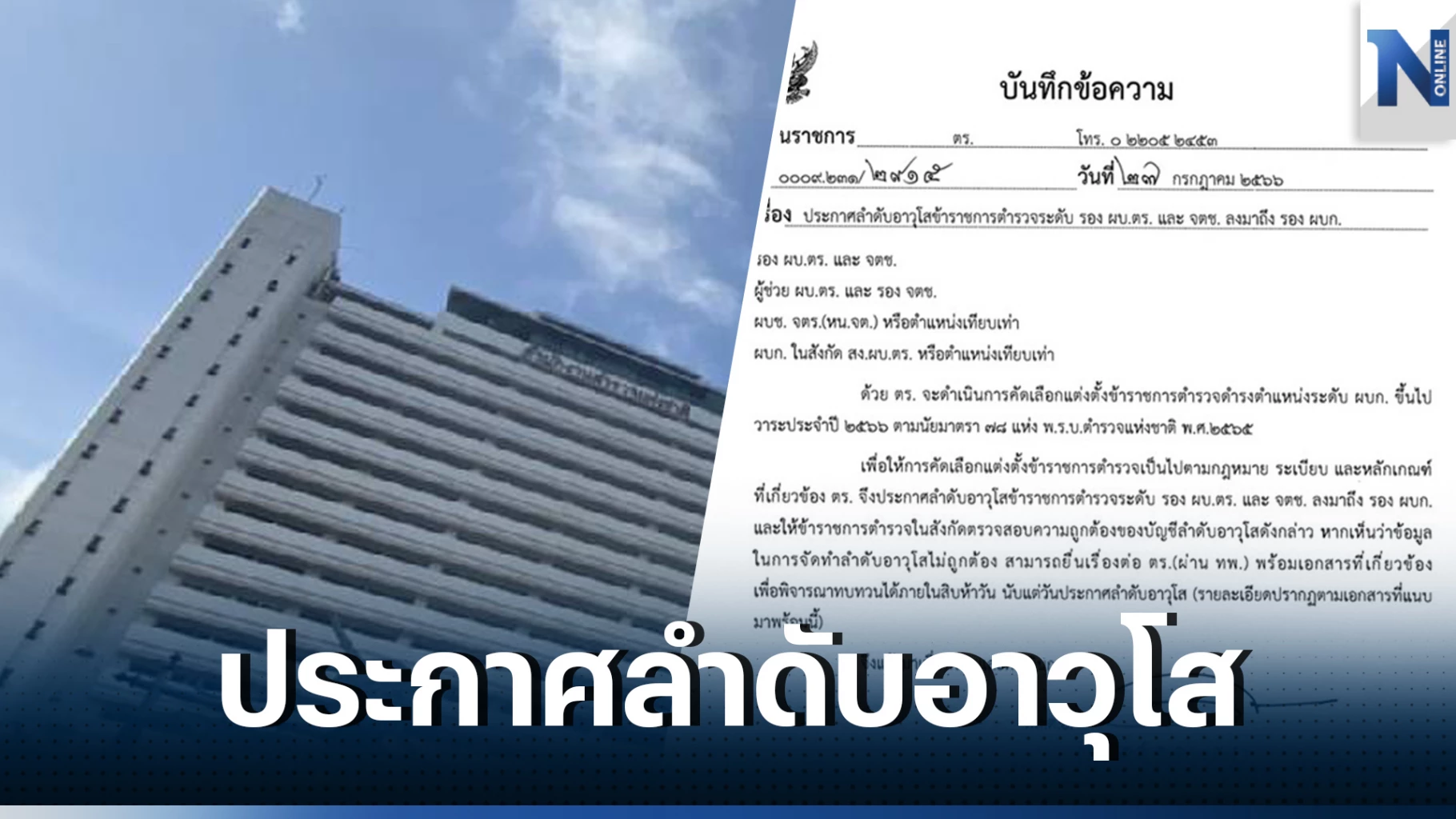 ด้วย ตร. จะดำเนินการคัดเลือกแต่งตั้งข้าราชการตำรวจดำรงตำแหน่งระดับ ผบก. ขึ้นไป วาระประจําปี 2566 ตามนัยมาตรา 78 แห่ง พ.ร.บ.ตำรวจแห่งชาติ พ.ศ.2565 เพื่อให้การคัดเลือกแต่งตั้งข้าราชการตำรวจเป็นไปตามกฎหมาย ระเบียบ และหลักเกณฑ์ ที่เกี่ยวข้อง ตร. จึงประกาศลำดับอาวุโสข้าราชการตำรวจระดับ รอง ผบ.ตร. และ จตช. ลงมาถึง รอง ผบก. และให้ข้าราชการตำรวจในสังกัดตรวจสอบความถูกต้องของบัญชีลำดับอาวุโสดังกล่าว หากเห็นว่าข้อมูล ในการจัดทำลำดับอาวุโสไม่ถูกต้อง สามารถยื่นเรื่องต่อ ตร. (ผ่าน ทพ.) พร้อมเอกสารที่เกี่ยวข้อง เพื่อพิจารณาทบทวนได้ภายใน 15 วัน นับแต่วันประกาศลำดับอาวุโส