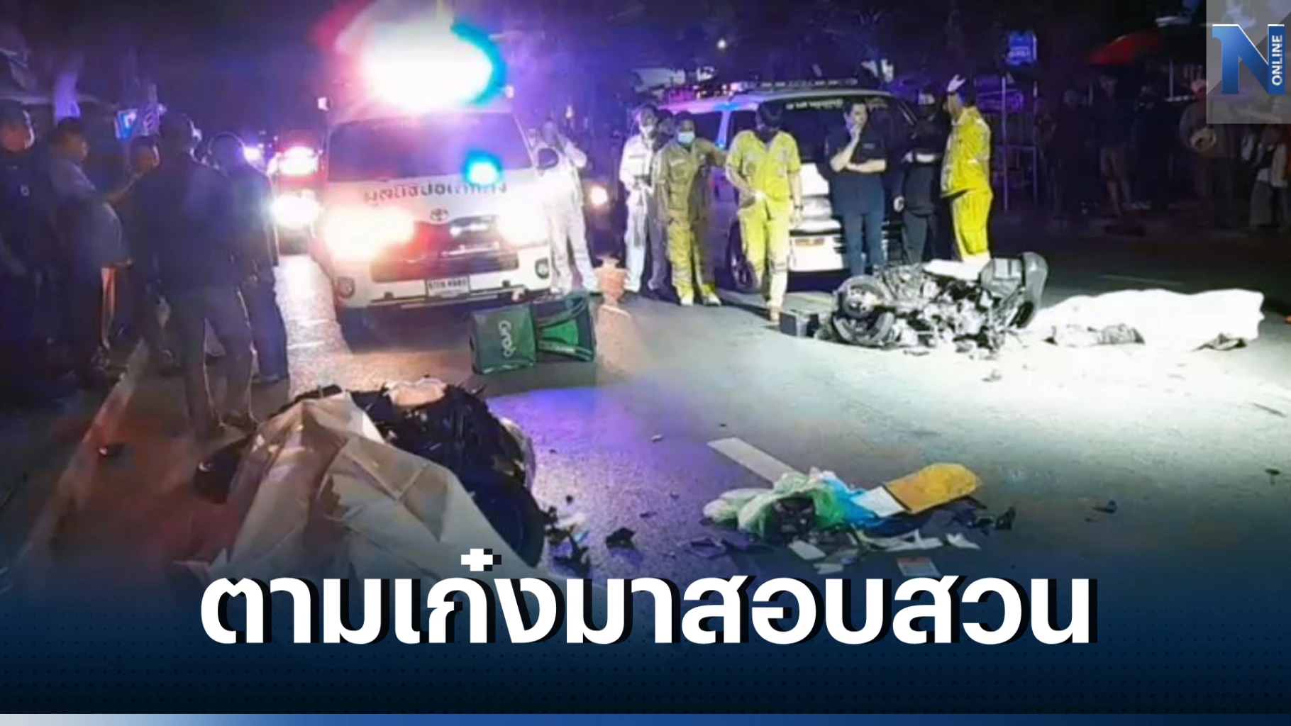ที่เกิดเหตุเป็นถนน 4 เลนแล่นสวนกันไม่มีเกาะกลาง บริเวณกลางถนนพบศพ นายประดิษฐ์ อายุ 31 ปี หนุ่มแกร็บฟู้ด นอนหงายเสียชีวิต สวมเครื่องแบบพนักงานแกร็บไบค์ มีบาดแผลใบหน้ายุบ ข้างกันพบรถมอเตอร์ไซค์ไฟฟ้าของผู้ตาย ยี่ห้อนิว รุ่นเอ็นคิวไอ สีขาวคาดเขียว ถูกพุ่งชนจนพังยับเยิน ห่างไป 3 เมตร พบรถ จยย.บิ๊กไบค์ คู่กรณี ยี่ห้อคาวาซากิ รุ่นนินจา 400 สีเทาดำ พลิกคว่ำอยู่ในช่องทางเดินรถซ้ายสุดฝั่งเดียวกัน ส่งผลให้ผู้ขับขี่เป็นชาย ไม่ทราบชื่อ ไม่พกพาเอกสารติดตัว อายุประมาณ 25-30 ปี สวมเสื้อยืดแขนสั้นสีขาว นุ่งกางเกงยีนส์ขายาวสีดำ คอหักเสียชีวิตคาที่