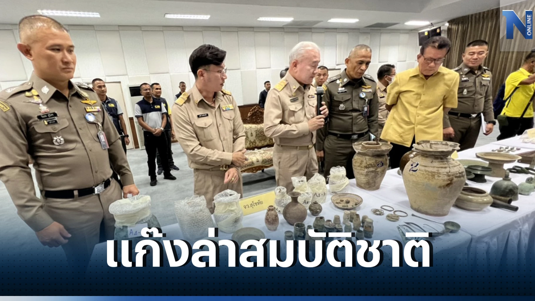4 กันยายน 2566 ที่กองบังคับการปราบปราม(บก.ป.) พล.ต.ท.จิรภพ ภูริเดช ผบช.ก. พร้อมด้วย พล.ต.ต.มนตรี เทศขัน ผบก.ป., พ.ต.อ.พัฒนศักดิ์ บุบผาสุวรรณ รอง ผบก.ป., พ.ต.อ.เอกสิทธิ์ ปานสีทา ผกก.4 บก.ป., นายพนมบุตร จันทรโชติ อธิบดีกรมศิลปากร กระทรวงวัฒนธรรม, นายมนตรี ธนภัทรพรชัย ผู้อำนวยการกลุ่มงานโบราณคดี สำนักศิลปากรที่ 6 สุโขทัย และนายชินณวุฒิ วิลยาลัย ผู้อำนวยการสำนักศิลปากรที่ 7 เชียงใหม่ และเจ้าหน้าที่สำนักศิลปากร ร่วมแถลงผลการจับกุม แก๊งนักล่าสมบัติโบราณ โพสต์ขายผ่านเฟซบุ๊ก หลังนำกำลังเข้าปิดล้อมตรวจค้นเป้าหมายจำนวน 9 จุด ในพื้นที่ จ.เชียงใหม่, พะเยา, สุโขทัยและลำปาง