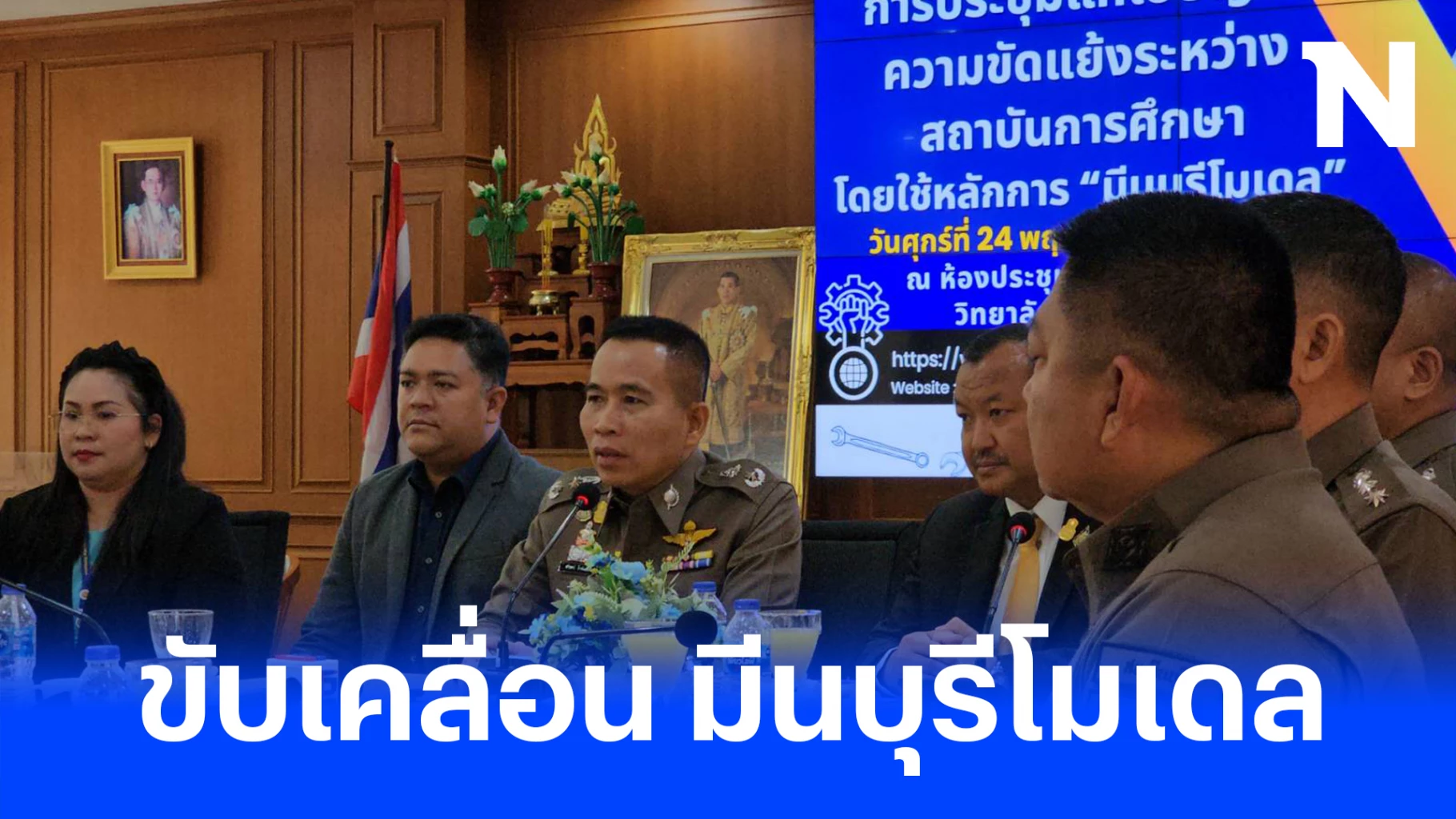 หลังการประชุมนานกว่า 1 ชั่วโมงครึ่ง พล.ต.ต.ชรินทร์ กล่าวว่าวันนี้เชิญผู้บริหารอาชีวะ ผู้บริหารเทคนิคมีนบุรี และตำรวจ 14 สน. มาพูดคุยปรึกษากันเพื่อปฏิบัติตามแนวทางมีนบุรีโมเดลที่ทำแล้วได้ผลดี สำนักงานตำรวจแห่งชาติ จึงอยากนำโมเดลนี้ไปใช้ลดความขัดแย้ง