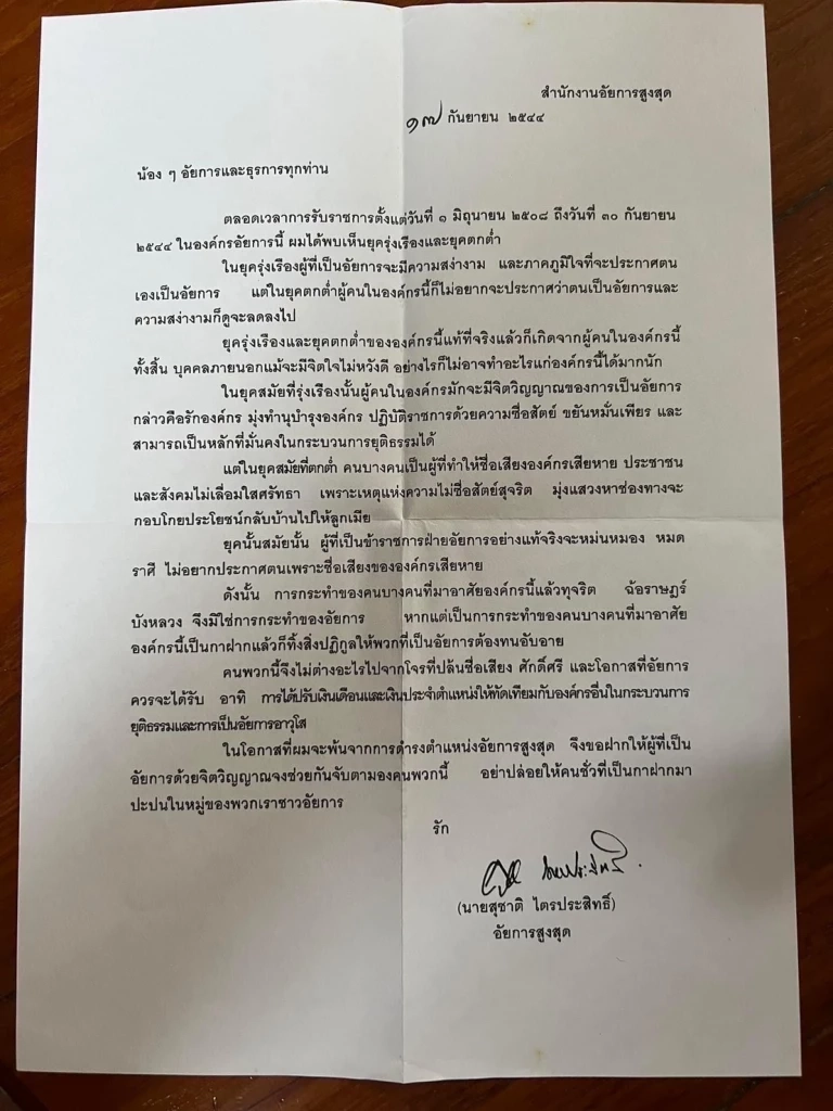 นอกจากนี้ยังมีรายอักษร นายสุชาติ ไตรประสิทธิ์ อัยการสูงสุด ได้เขียนไว้เมื่อครั้งตรวจเยี่ยม สำนักงานอัยการจังหวัดพัทลุง เมื่อวันที่ 26 ก.ค.44 ความว่า องค์กรอัยการจะเจริญรุ่งเรื่องหรือตกต่ำก็ขึ้นอยู่กับบุคลากร ที่เป็นข้าราชการ หากมีบุคลากรที่มุ่งแสวงหาประโยชน์ส่วนตนมากเท่าใด องค์กรอัยการก็จะตกต่ำเพียงนั้น ดังนั้นเป็นหน้าที่ของพวกเราที่เป็นอัยการ และมีจิตวิญญาณรักองค์กรนี้ ต้องช่วยกันดูผู้ที่แอบแฝงมาใช้ชื่ออัยการแล้วหากินเพื่อประโยชน์ส่วนตนหรือครอบครัวแล้วช่วยกำจัดออกไปโดยเร่งแจ้งให้ผู้มีหน้าที่กำจัดพวกนี้ให้ทราบและอย่าไปคบหากับพวกที่แอบแฝงนี้