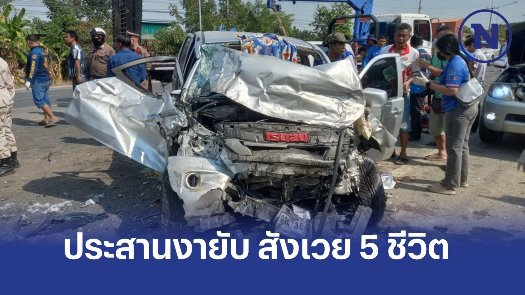 ส่วนรถคู่กรณีที่ชนประสานงากัน อยู่ห่างออกไปประมาณ 4 เมตร เป็นรถกระบะยี่ห้ออีซูซุ สีบรอนซ์เงิน สภาพพังยับเยิน มีผู้ที่ติดอยู่ในซากรถ 5 ราย เจ้าหน้าที่กู้ภัยใช้เครื่องตัดถ่างช่วยเหลือออกมา 2 ราย อาการสาหัส เร่งนำส่งโรงพยาบาลป่าโมก