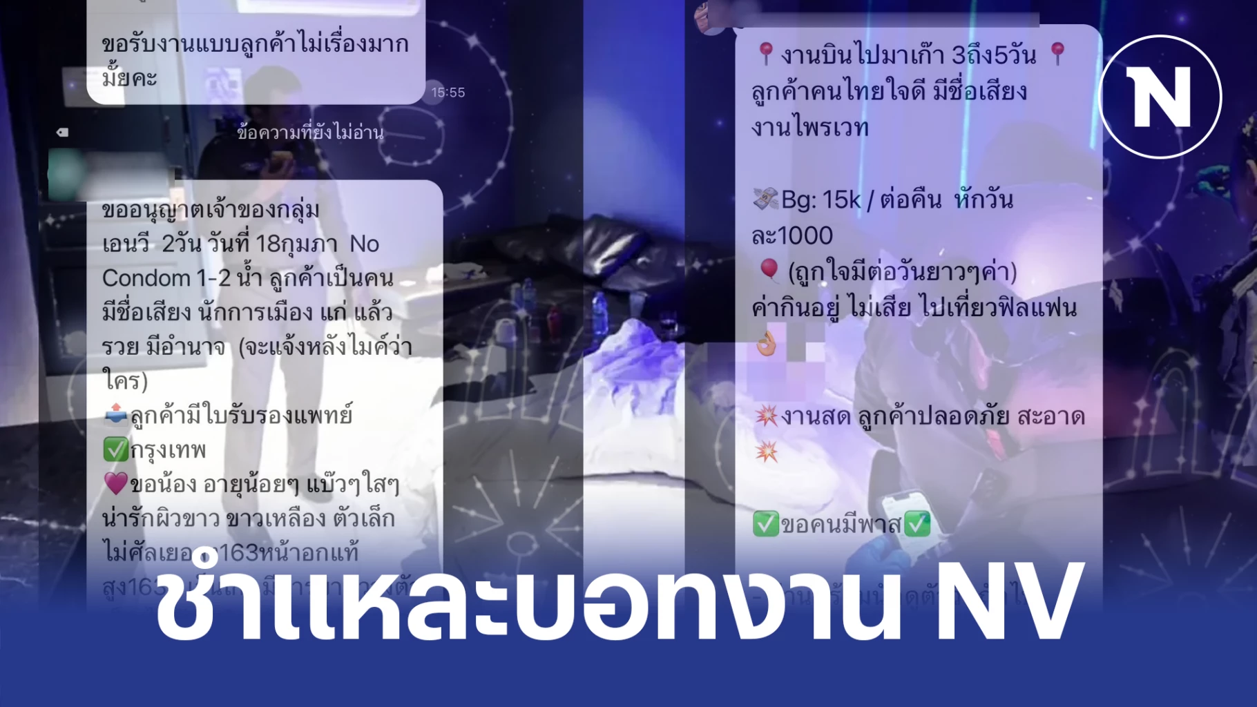 หรือ อีกการประกาศรับงานหนึ่ง ในกลุ่มบอร์ดงาน NV คือ ต้องการเด็ก N ที่จะส่งให้นักการเมือง มีชื่อเสียง เเต่เเก่เเล้ว รวย เเละ มีอำนาจ ให้เด็กที่รับงานส่งรูปเข้าไป จะเเจ้งเฉพาะคนที่ได้รับเลือก โดยจ่ายค่าตัว 35,000 บาท ทำงาน 2 วัน
