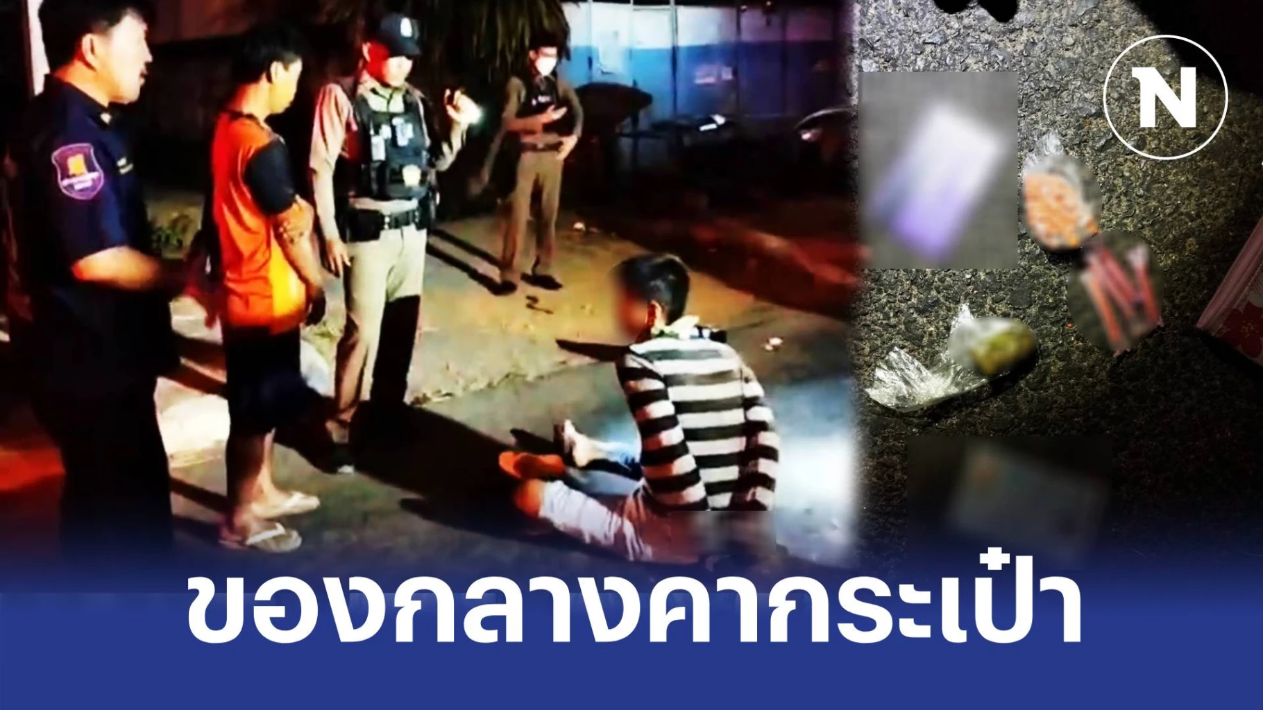 โดยระหว่างทำการตรวจค้นพบยาเสพติดจำนวนหนึ่งอยู่ในกระเป๋าสะพาย เมื่อเปิดดูพบกัญชา 1 ก้อน ฟอยล์ 1 ม้วน ยาบ้า ใส่หลอด 10 เม็ด จำนวน 4 หลอด และบรรจุอยู่ในถุง ประมาณ 100 เม็ด