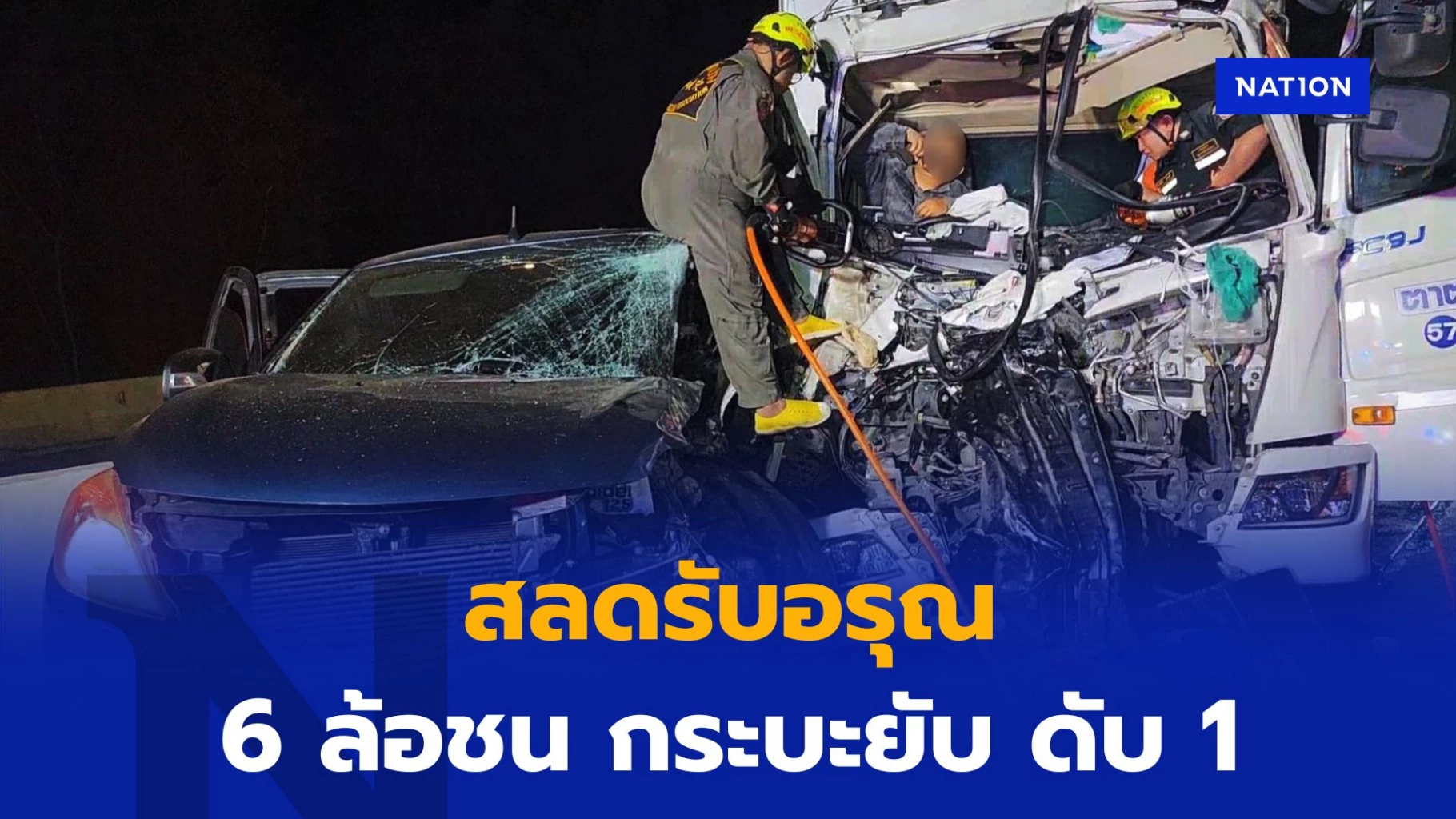 นอกยังมีรถกระบะสีเทาดำ สภาพสภาพพังยับ โดยรถทั้ง 2 คัน อยู่ในลักษณะชนเหมือนแพติดกัน