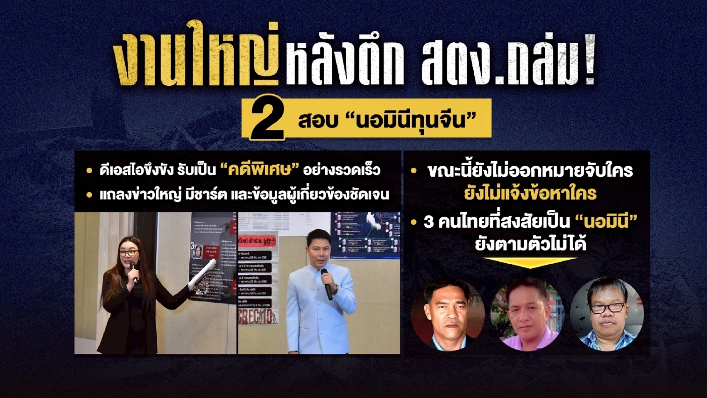 ดีเอสไอ รับเป็นคดีพิเศษ อย่างรวดเร็ว มีแถลงข่าวใหญ่ มีการเปิดชาร์ตและข้อมูลผู้เกี่ยวข้องกับบริษัทเอกชน ไชน่า เรลเวย์ นัมเบอร์ 10 แต่ยังไม่ออกหมายจับใคร ยังไม่แจ้งข้อหาใคร รวมทั้ง 3 คนไทยที่สงสัยเป็น “นอมินี” ยังตามตัวไม่ได้