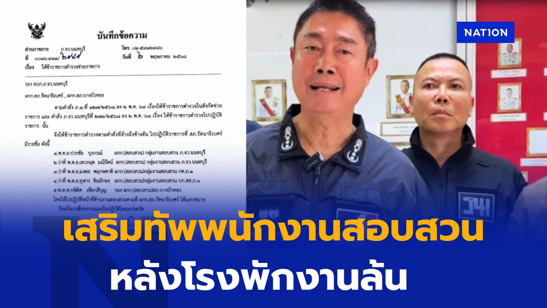 3 พฤษภาคม 2568 ล่าสุด ตำรวจภูธรจังหวัดนนทบุรี ได้ออกคำสั่งแต่งตั้งเจ้าหน้าที่ตำรวจจากหน่วยงานอื่นเข้ามาช่วยสนับสนุนภารกิจเร่งด่วน โดยระบุว่า