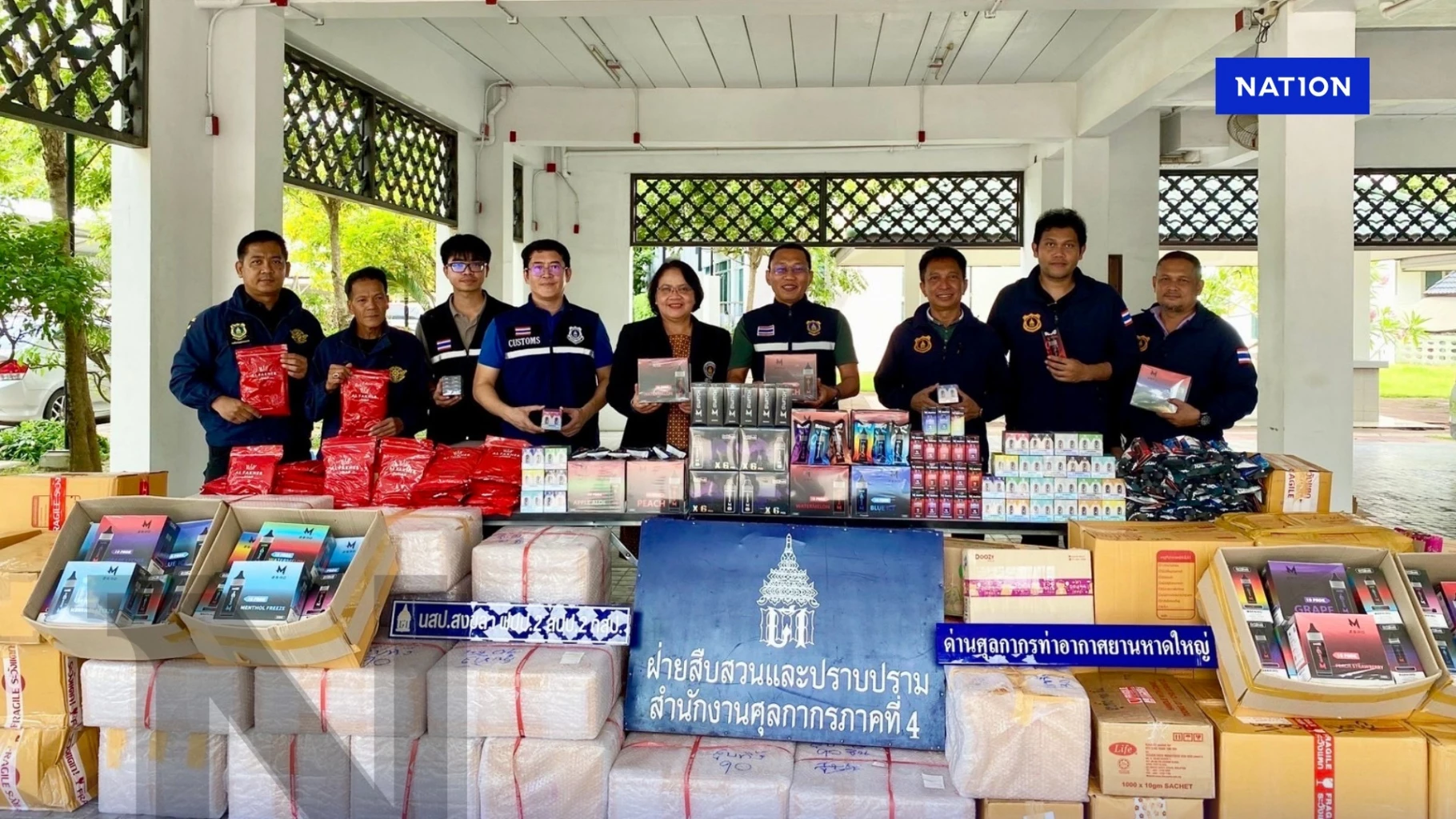 เมื่อวันที่ 5 มิถุนายน นายธนกฤต ลิ้นทอง ผู้อำนวยการสำนักงานศุลกากรภาคที่ 4 เปิดเผยว่า วันที่ 1 - 3 มิถุนายน2568 เจ้าหน้าที่ฝ่ายสืบสวนและปราบปราม สคศ. ศภ.4 ร่วมกับหน่วยสืบสวนปราบปรามสงขลา สปป.2 กสป. และด่านศุลกากรท่าอากาศยานหาดใหญ่ ได้ออกปฏิบัติการด้านการป้องกันและปราบปรามการลักลอบหนีศุลกากรได้เข้าตรวจค้นพัสดุในบริษัทขนส่งเอกชนในพื้นที่อำเภอหาดใหญ่ จังหวัดสงขลา ผลการตรวจค้นพบ บุหรี่ไฟฟ้าและอุปกรณ์ จำนวน 6,390 ชิ้น มูลค่า 2,483,000 บาท และบารากู่ จำนวน 30 กิโลกรัม มูลค่า 30,000 บาท รวมมูลค่าทั้งสิ้น 2,513,000 บาท ซึ่งบุหรี่ไฟฟ้าและบารากู่เป็นของต้องห้ามตามประกาศกระทรวงพาณิชย์ เรื่อง กำหนดให้บารากู่และบารากู่ไฟฟ้าหรือบุหรี่ไฟฟ้าเป็นสินค้าที่ต้องห้ามในการนำเข้ามาในราชอาณาจักร พ.ศ. 2557 ลงวันที่ 12 ธันวาคม 2557 ซึ่งเป็นอันตรายต่อสุขภาพ สุขอนามัย สังคม ความมั่นคงของประเทศและความสงบเรียบร้อยและศีลธรรมอันดีของประชาชน