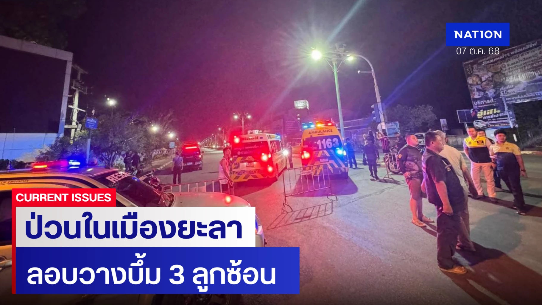 7 ตุลาคม 2568 ที่ จ.ยะลา มีรายงานว่า เมื่อเวลา 21.24 น. ได้เกิดเหตุระเบิดขึ้นบริเวณริมรั้ว สนามศูนย์เยาวชนเทศบาลนครยะลา ถนนสิโรส อ.เมือง จ.ยะลา