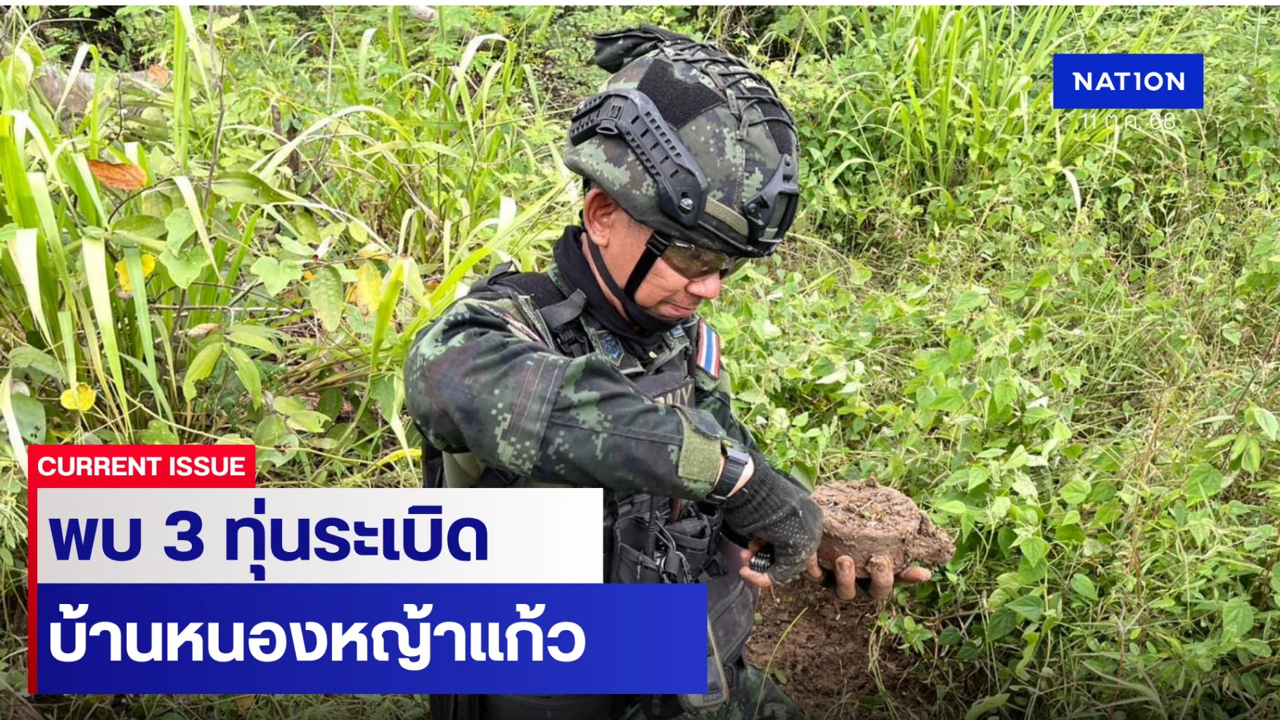 11 ตุลาคม 2568 กองกำลังบูรพา (กกล.บูรพา) โดยกองบังคับการเฉพาะกิจที่ 12 (ฉก.12) ได้รายงานการตรวจพบ “ทุ่นระเบิดสังหารบุคคล” จำนวน 3 ทุ่น ในพื้นที่ปฏิบัติการบ้บ้านหนองหญ้าแก้ว ตำบลโคกสูง อำเภอโคกสูง จังหวัดสระแก้ว ซึ่งเป็นพื้นที่ชายแดนไทย-กัมพูชา โดยชุดตรวจค้นได้ดำเนินการอย่างต่อเนื่อง เพื่อความปลอดภัยของประชาชน พร้อมกันนี้ได้ทำการเก็บกู้ทุ่นระเบิดทั้ง 3 ทุ่น ตามขั้นตอนเรียบร้อยแล้ว