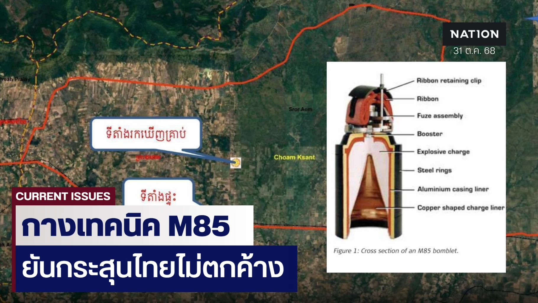 31 ตุลาคม 2568 จากกรณีที่สำนักข่าวกัมพูชา นำเสนอข่าวว่าหน่วยปฏิบัติการทุ่นระเบิดกัมพูชา (CMAC) ได้ออกเอกสารชี้แจงผลการตรวจสอบเหตุระเบิด เมื่อวันที่ 25 ตุลาคม 2568 ในพื้นที่อำเภอจอมกระสาน จังหวัดพระวิหาร ซึ่งเป็นเหตุให้เด็กชายอายุ 10 ขวบเสียชีวิต และบิดาได้รับบาดเจ็บสาหัส โดยสาระสำคัญในเอกสารดังกล่าว ระบุผลการตรวจทางนิติวิทยาศาสตร์ พร้อมภาพถ่ายจากจุดเกิดเหตุ สรุปว่า “วัตถุระเบิดที่ทำให้เสียชีวิตและบาดเจ็บ เป็นระเบิดแบบคลัสเตอร์ M-85 จากกระสุนแบบ M396 ซึ่งยิงมาจากปืนใหญ่ขนาด 155 มิลลิเมตรของกองทัพไทย” และอ้างว่าเป็นเศษวัตถุระเบิดที่ตกค้างจากเหตุปะทะระหว่าง 24–28 กรกฎาคม 2568 ที่ผ่านมา
