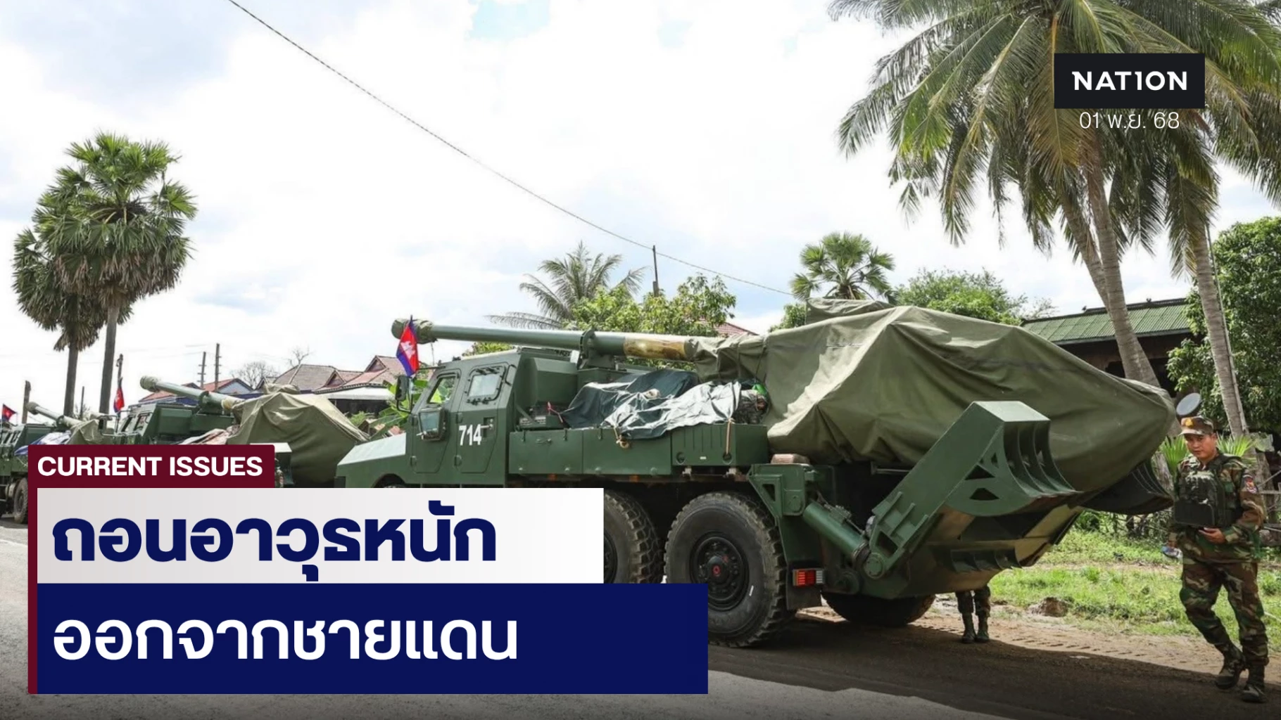 1 พฤศจิกายน 2568 เพจ Army military force ระบุว่า เมื่อเวลา 18:00 น. กระทรวงกลาโหมกัมพูชา รายงานว่ากองทัพบกกัมพูชาถอนปืนใหญ่อัตตาจร SH-1 ขนาด 155 มม. พร้อมด้วยรถยิงจรวดหลายลำกล้อง Type 90 ขนาด122 มม. ออกจากแนวหน้าในฝั่งอุดรมีชัย ซึ่งเป็นข้อตกลงการถอนอาวุธหนักระหว่างกองทัพกัมพูชาและไทยในระยะที่1 โดยจะขนย้ายอาวุธออกจากพื้นที่ชายแดนที่มีข้อพิพาทของทั้งสองประเทศ เพื่อนำกลับไปยังฐานที่ตั้งเดิม