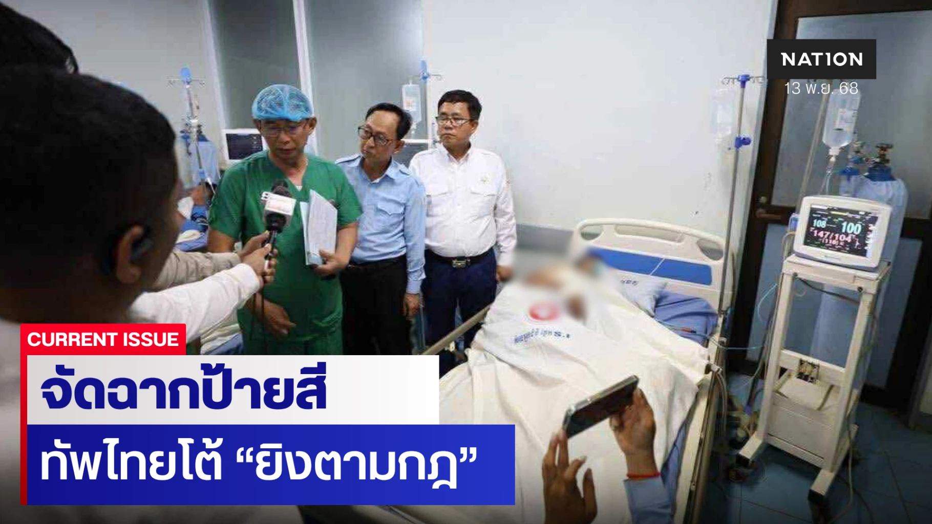 ขณะที่ เหมนการละครจัด หมอ-นักการเมืองให้สัมภาษณ์นักข่าวกลางห้อง ICU ระหว่างทำการรักษาพลเรือนกัมพูชาทั้ง 3 รายที่อ้างว่าพวกเขาอยู่ในอาการโคม่าและยังไม่พ้นวิกฤต หลังถูกทหารไทยใช้ปืนกลเบาโซเวียต RPD ยิx ชาวบ้านในชุมชนบ้านเปรยจัน จนเสียชีวิต 1 รายและบาดเจ็บอีก 3 ราย