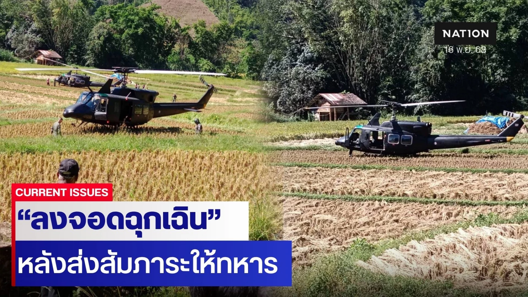16 พฤศจิกายน 2568 เวลาประมาณ 11.00 น. ราษฎรบ้านห้วยต้นนุ่น ต.แม่เงา อ.ขุนยวม จ.แม่ฮ่องสอน แจ้งเหตุพบ เฮลิคอปเตอร์ของ หน่วยเฉพาะกิจสิงหนาท รุ่น เบลล์ 212 จำนวน 1 ลำ ลงจอดฉุกเฉินในที่นาของราษฎรที่เพิ่งเกี่ยวข้าวเสร็จใหม่ ๆ สร้างความตกใจให้กับราษฎรในพื้นที่เป็นอย่างมาก