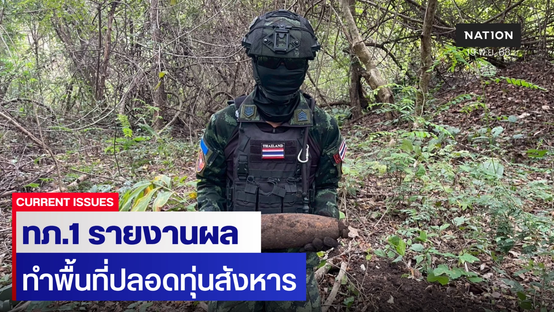 19 พฤศจิกายน 2568 กองทัพภาคที่ 1 กองกำลังบูรพา ฉก.12 โดย หน่วยปฏิบัติการทุ่นระเบิดด้านมนุษยธรรมที่ 1 ร่วมกับกองพันทหารช่างที่ 2 รายงานผลการปฏิบัติงานทำพื้นที่ให้ปลอดภัย พื้นที่อันตรายต้องสงสัยที่เหลืออยู่ (บ้านหนองจาน พื้นที่ C) เริ่มปฏิบัติงาน 11 พ.ย.68 โดยมีผลการปฏิบัติ ประจำวันที่ 19 พ.ย.68 ดังนี้