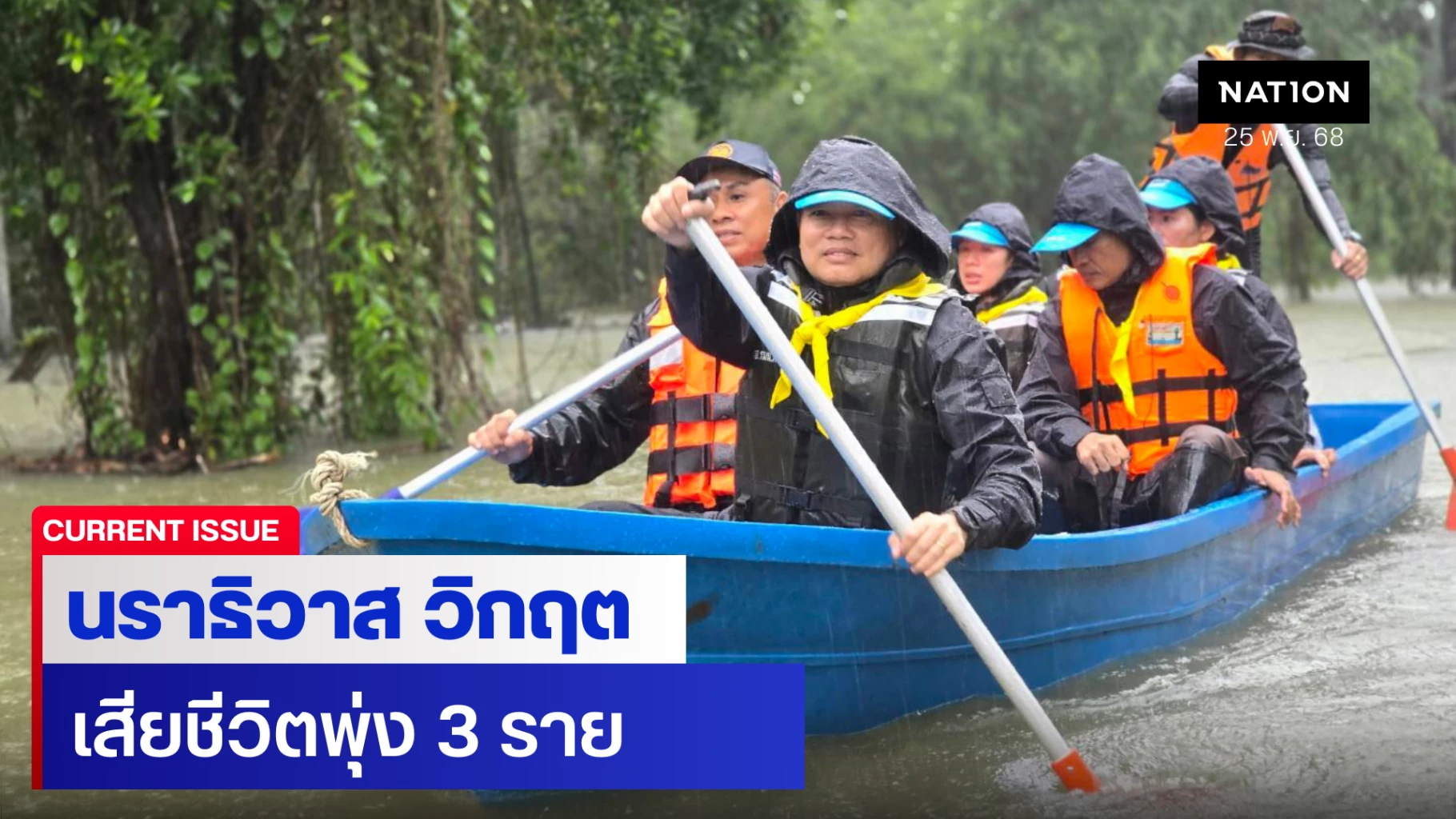 25 พฤศจิกายน 2568 สถานการณ์น้ำท่วมพื้นที่ จ.นราธิวาส หลังจากฝนตกลงมาอย่างต่อเนื่องและหนักมากในบางพื้นที่ตลอด 1 สัปดาห์ที่ผ่านมา ทำให้สภาวะน้ำท่วมขังพื้นที่การเกษตรและบ้านเรือนของประชาชน ขยายเป็นวงกว้างจากช่วงเช้า 9 อำเภอ เป็น 11 อำเภอแล้ว ประกอบด้วย อำเภอบาเจาะ, ยี่งอ, เมืองนราธิวาส, ระแงะ, ตากใบ, สุไหงปาดี, ศรีสาคร, รือเสาะ, สุไหงโก-ลก, สุคิริน และอำเภอเจาะไอร้อง รวมพื้นที่ได้รับผลกระทบมีน้ำท่วมขัง 56 ตำบล 46 ชุมชน 364 หมู่บ้าน ชาวบ้านได้รับความเดือดร้อน 74,595 ครัวเรือน รวม 255,371 คน และ มีผู้เสียชีวิตเพิ่มเติมเป็น 3 ราย คือ 1.นางสาวจุฑาทิพ วัธนพร อายุ 50 ปี 2.นางคอลีเยาะ มะโซ๊ะ อายุ 60 ปี และ 3.นางสาวแอเสาะ ดอเลาะ อายุ 56 ปี