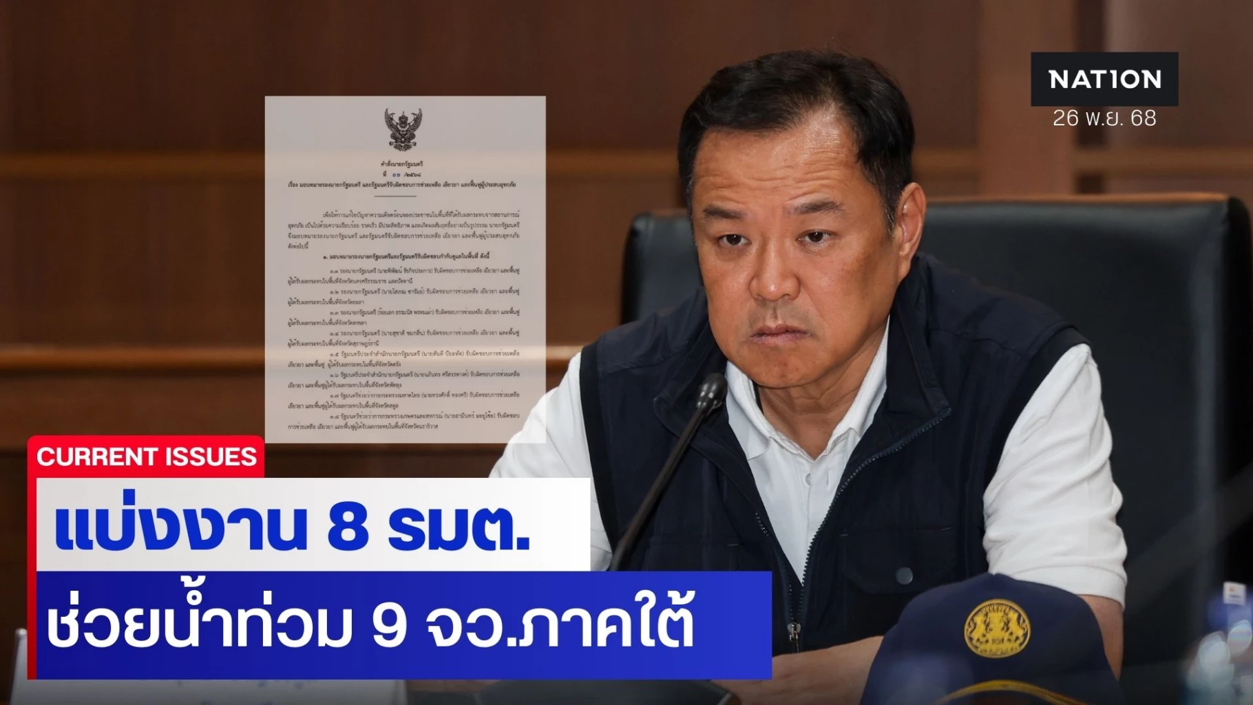26 พฤศจิกายน 2568 จากสถานการณ์น้ำท่วมภาคใต้ วิกฤตหลายพื้นที่ โดยเฉพาะน้ำท่วมหาดใหญ่ และอีกหลายพื้นที่ในจ.สงขลา นายอนุทิน ชาญวีรกูล นายกรัฐมนตรี และ รมว.มหาดไทย ลงนามคำสั่งนายกรัฐมนตรีที่ 11/2568 เรื่อง มอบหมายรองนายกรัฐมนตรี(รองนายกฯ) และรัฐมนตรี(รมต.)รับผิดชอบการช่วยเหลือ เยียวยา และฟื้นฟูผู้ประสบอุทกภัย เพื่อให้การแก้ไขปัญหาความเดือดร้อนของประชาชนในพื้นที่ที่ได้รับผลกระทบจากสถานการณ์อุทกภัย เป็นไปด้วยความเรียบร้อย รวดเร็ว มีประสิทธิภาพ และเกิดผลสัมฤทธิ์อย่างเป็นรูปธรรม