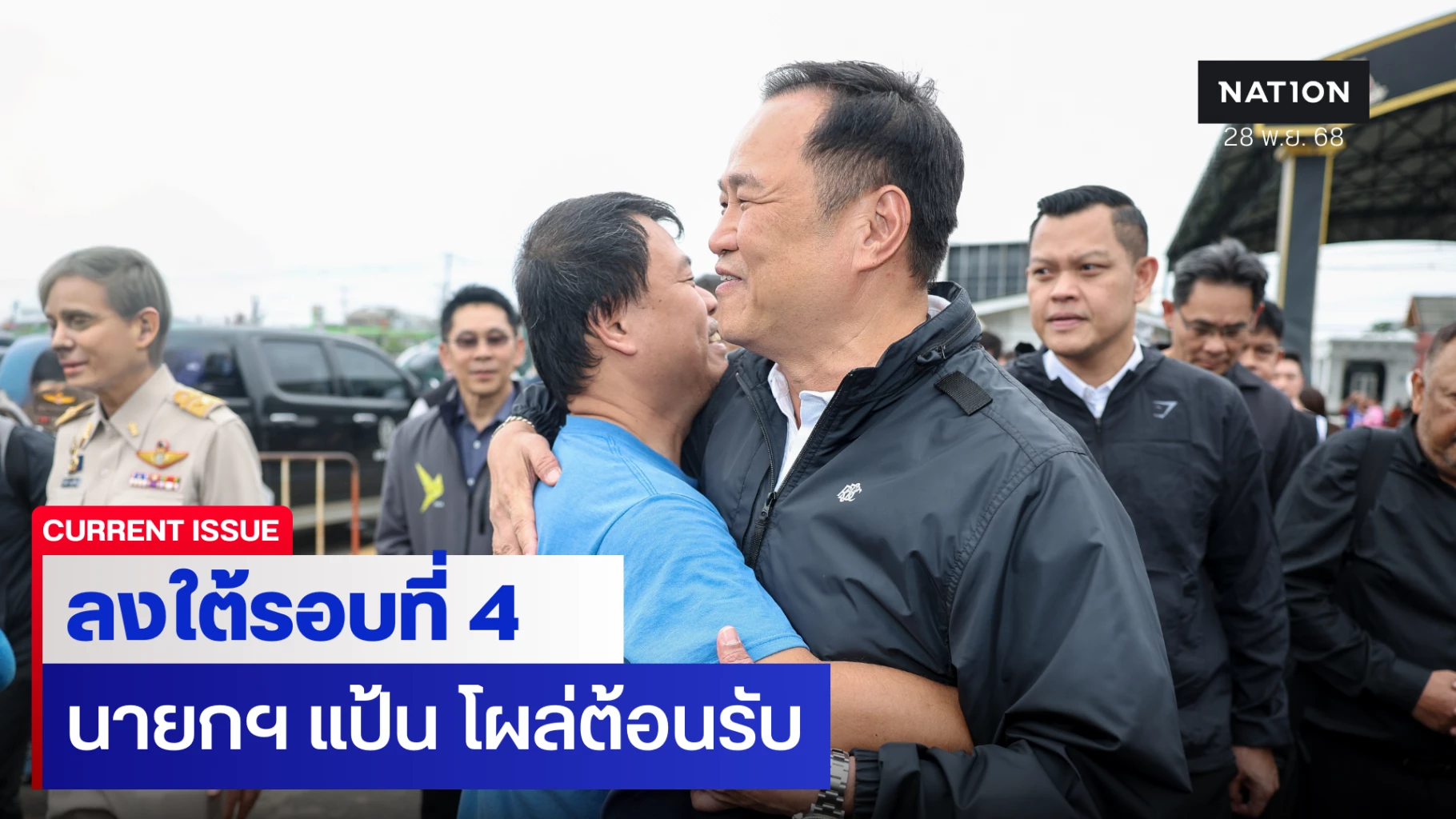จากนั้น มีชาวบ้านผู้ชาย ตะโกนเรียกนายกฯ ก่อนจะฝ่าวงล้อมของคณะผู้ติดตามเข้ามา ซึ่งนายกฯ ได้หันไปบอกกับคณะผู้ติดตามว่า "ไม่เป็นไร ให้เขาเข้ามา" จากนั้นชายดังกล่าวได้ยกมือขอบคุณนายกฯ พร้อมจับมือและสวมกอด พร้อมบอกว่า “ช่วยชาวบ้านด้วยนะครับ” ก่อนที่นายกฯจะบอกว่า “นี่ก็มาช่วยดูแลช่วยเหลืออยู่ ขอบคุณมากที่อดทน”