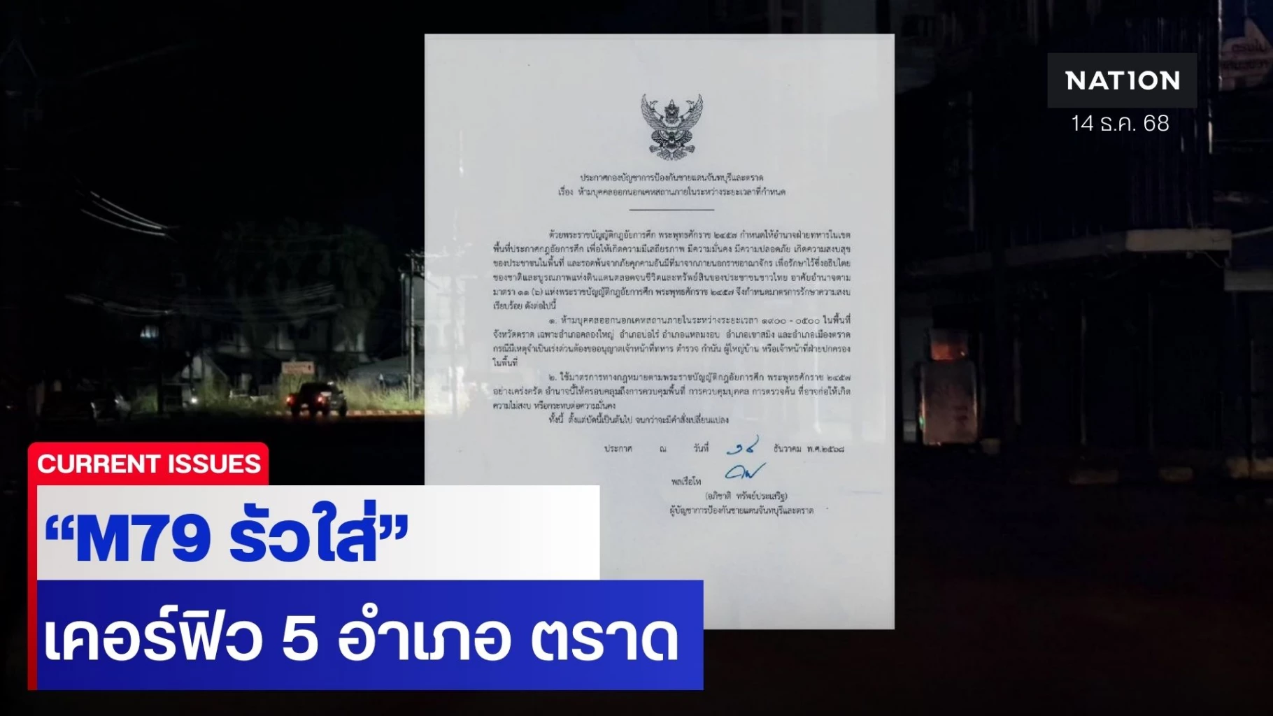 14 ธันวาคม 2568 รายงานข่าวจากกองกำลังป้องกันชายแดนจันทบุรีและตราด (กปช.จต.) ได้ประกาศสถานการณ์ฉุกเฉิน (เคอร์ฟิว) ในพื้นที่ 5 อำเภอ จ.ตราด ตั้งแต่บัดนี้เป็นต้นไป ความว่า