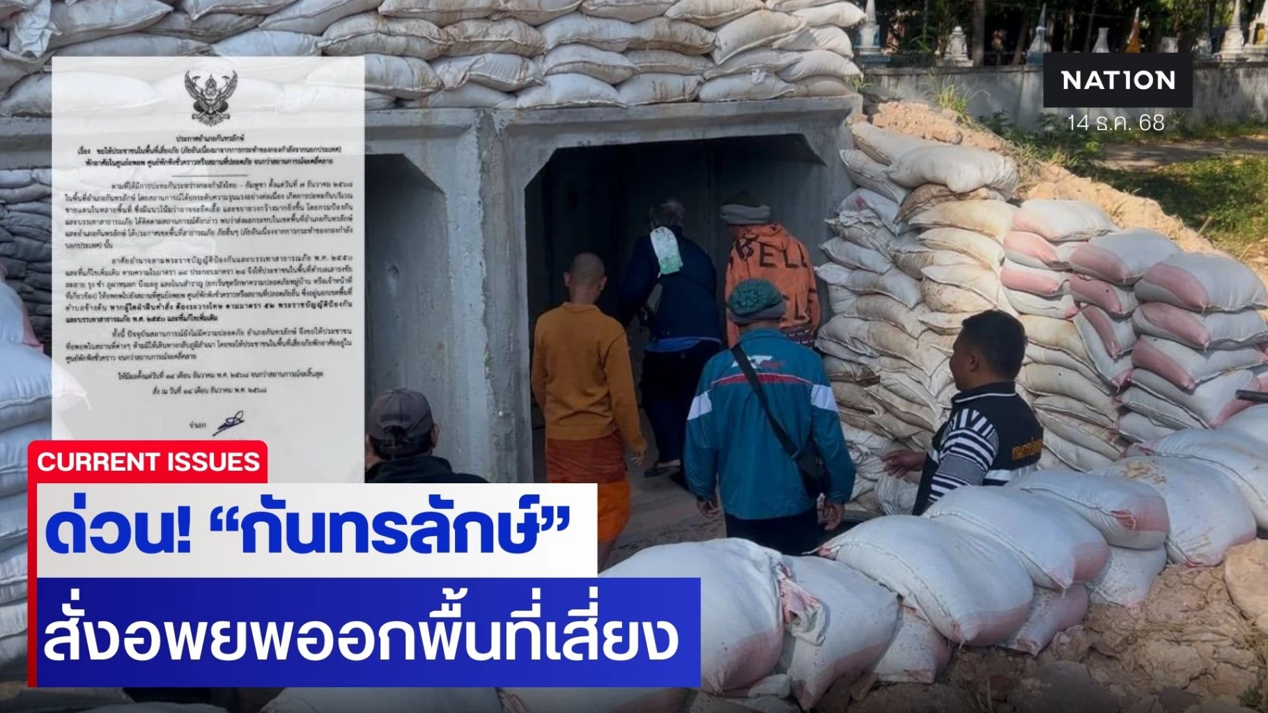14 ธันวาคม 2568 ที่อำเภอกันทรลักษ์ จังหวัดศรีสะเกษ ออกประกาศขอความร่วมมือประชาชนในพื้นที่เสี่ยงภัย อพยพไปยังศูนย์อพยพ ศูนย์พักพิงชั่วคราว หรือสถานที่ปลอดภัยเป็นการชั่วคราว เนื่องจากสถานการณ์การกระทำของกองกำลังจากนอกประเทศที่ยังคงมีความรุนแรงและต่อเนื่อง