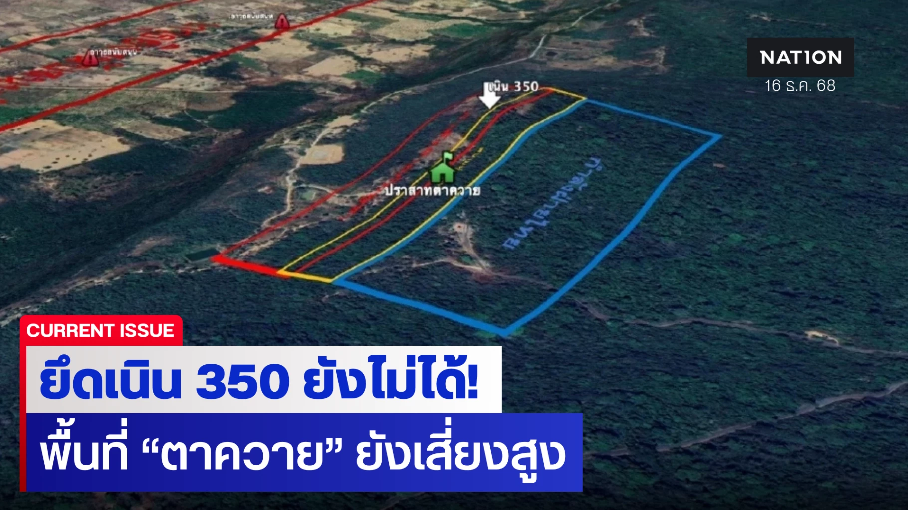 16 ธันวาคม 2568 แหล่งข่าวระดับสูงจากกองทัพบก ยอมรับว่า สถานการณ์ที่ปราสาทตาควาย ทหารไทยยึดได้เฉพาะตัวปราสาท แต่ยังไม่สามารถยึดเนิน 350 ที่อยู่เหนือขึ้นไปได้ ฉะนั้นภาพรวมยังมีความเสี่ยง