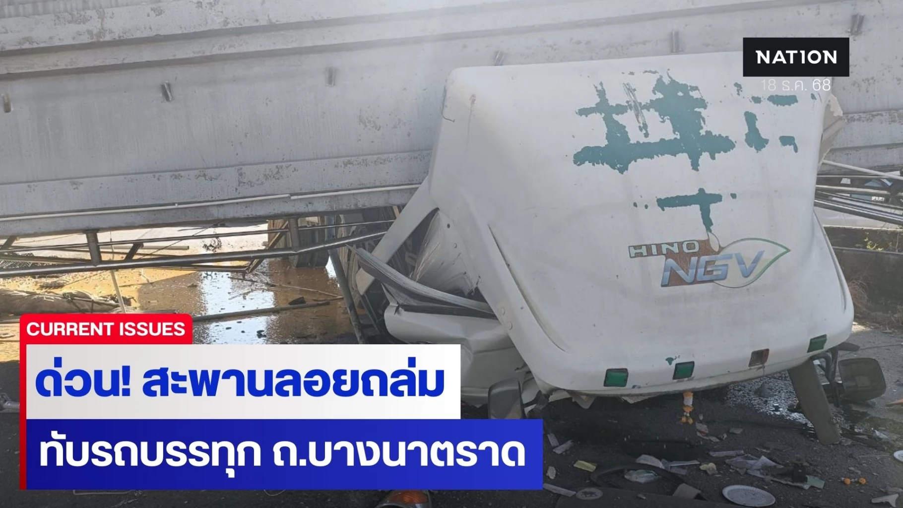 18 ธันวาคม 2568 ผู้สื่อข่าวรายงานว่า เกิดเหตุ สะพานลอยถล่มลงมาทับรถบรรทุก บริเวณตรงข้ามตลาดนำไทย ถนนบางนา-ตราด ต.บางพลีน้อย อ.บางบ่อ จ.สมุทรปราการ