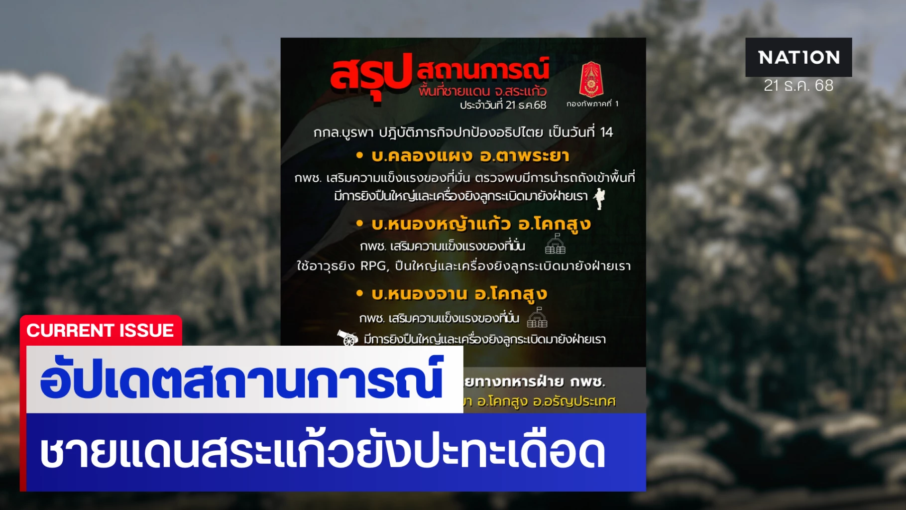 21 ธันวาคม 2568 ศูนย์ปฏิบัติการกองทัพภาคที่ 1 สรุปสถานการณ์ชายแดนไทย-กัมพูชา พื้นที่ จ.สระแก้ว เวลา 18.00 น. โดย กกล.บูรพา ปฏิบัติภารกิจปกป้องอธิปไตย เป็นวันที่ 14 มีการรบปะทะเพื่อยึดครองใน 3 พื้นที่ คือ