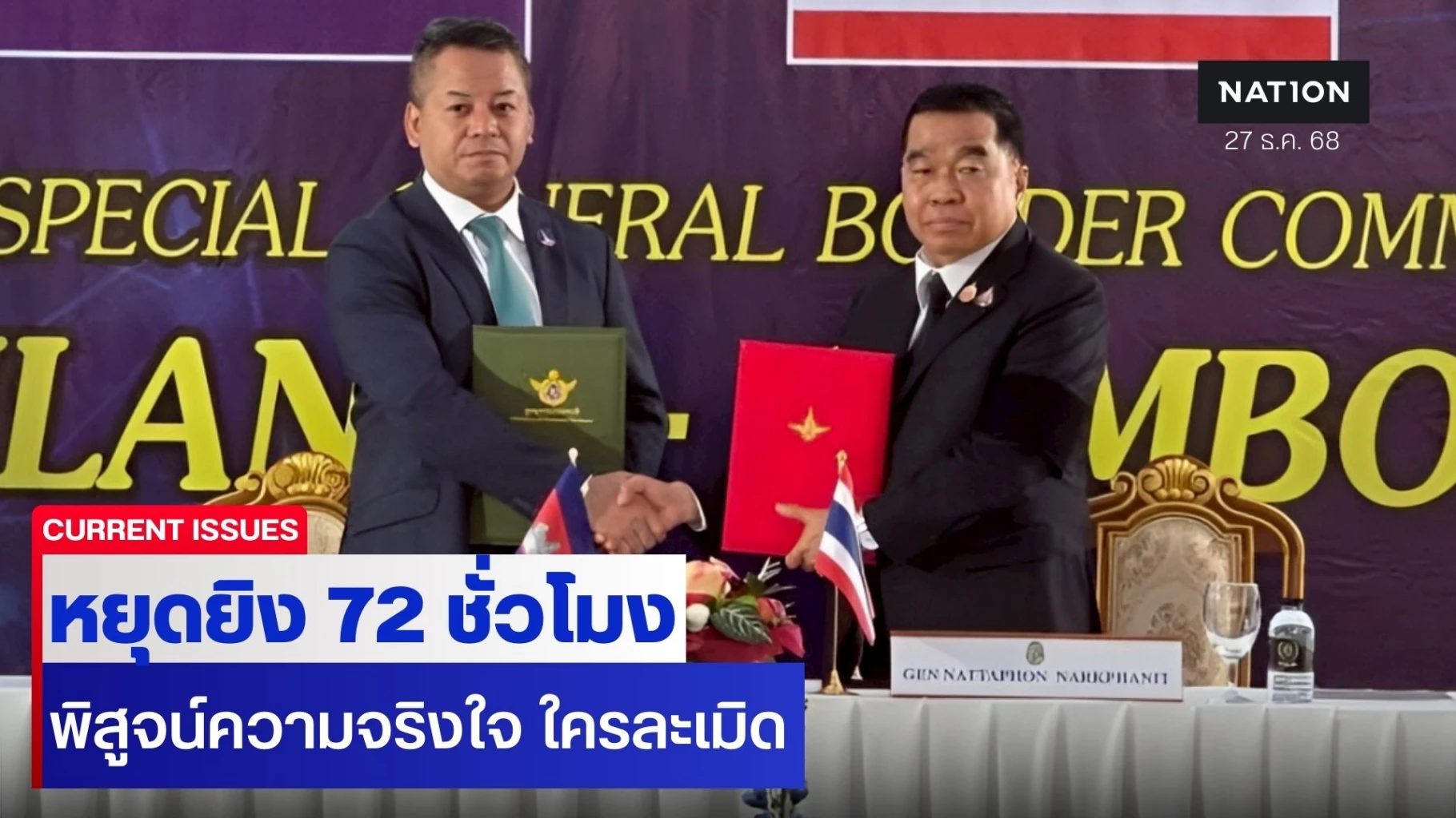 27 ธันวาคม 2568 สำหรับถ้อยแถลงผลการประชุม คณะกรรมการชายแดนทั่วไปกัมพูชา-ไทย (GBC) ที่ให้หยุดยิงวันนี้ ตั้งแต่ 12.00 น. เป็นต้นไป โดยมีห้วงเวลาเฝ้าระวัง 72 ชั่วโมง