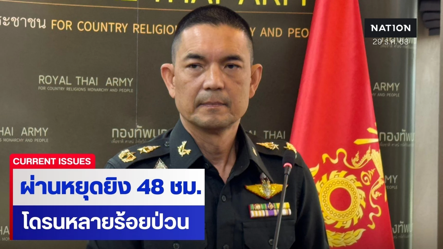 29 ธันวาคม 2568 ที่กองทัพบก พล.ต.วินธัย สุวารี โฆษกกองทัพบก กล่าวถึงกรณีกองทัพภาคที่ 2 รายงานสถานการณ์ชายแดนไทย-กัมพูชา ว่า ฝ่ายกัมพูชาบินอากาศยานไร้คนขับ(โดรน) ล้ำแดนเข้ามาอธิปไตยไทย จำนวนกว่า 250 ลำ โดยเฉพาะพื้นที่ช่องบก ช่องอานม้า จ.อุบลราชธานี เขาสัตตะโสม จ.ศรีสะเกษ ช่องสายตะกู จ.บุรีรัมย์ อาจเป็นการกระทำยั่วยุและละเมิดมาตรการความตึงเครียดของถ้อยแถลงร่วมฯ จากผลการประชุม GBC ว่า