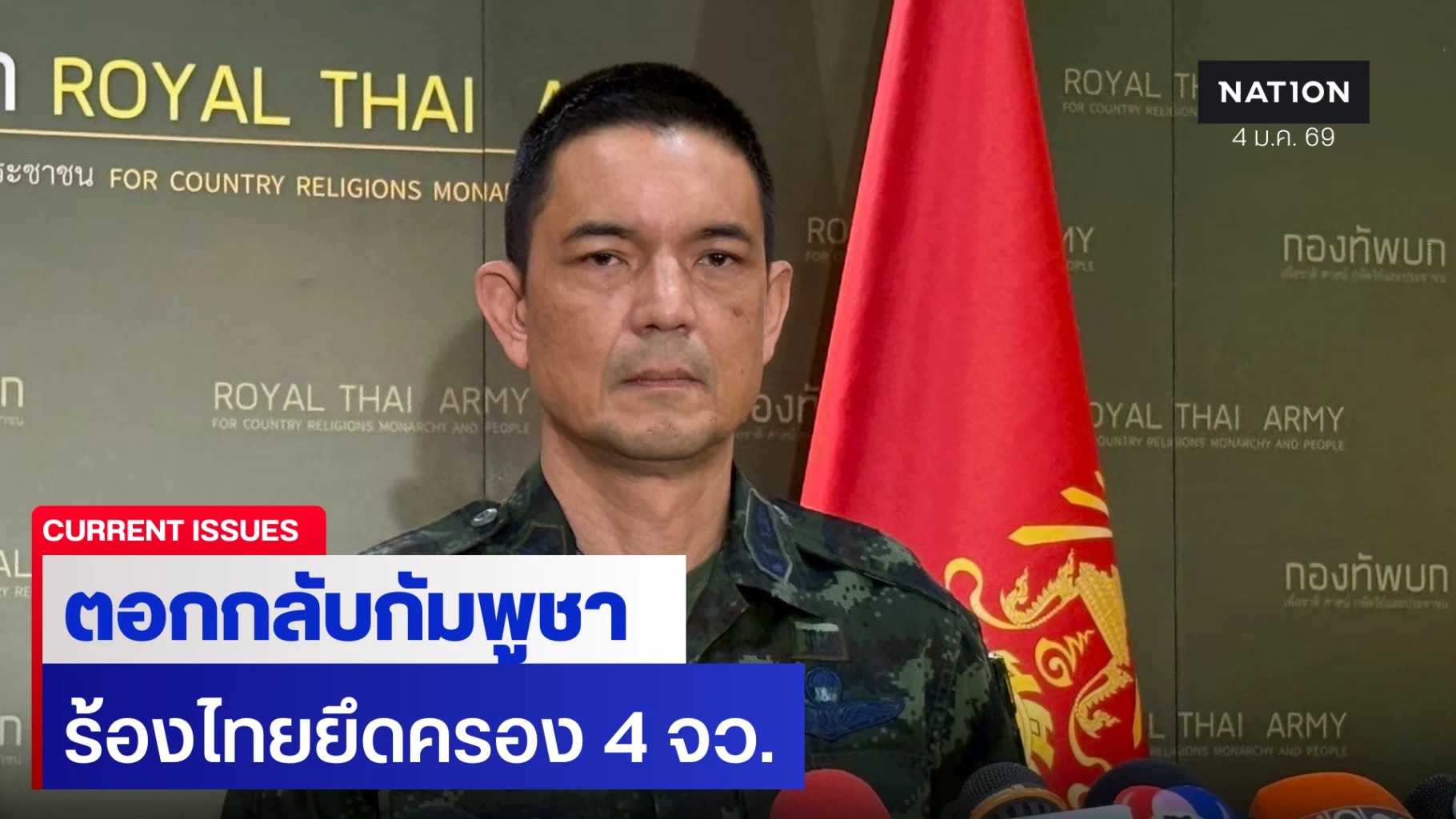 4 มกราคม 2569 พลตรี วินธัย สุวารี โฆษกกองทัพบก ชี้แจงกรณีกระทรวงการต่างประเทศกัมพูชา ยื่นหนังสือประท้วงฝ่ายไทย ที่เข้าไปยึดครองพื้นที่ซึ่งตั้งอยู่ในดินแดนของกัมพูชาใน 4 จังหวัด โดยยืนยันว่า ฝ่ายไทยไม่ได้เข้าไปยึดครองพื้นที่ในเขตแดนของกัมพูชา ทุกพื้นที่ที่ฝ่ายไทยเข้าควบคุมดำเนินการจัดระเบียบพื้นที่ ล้วนอยู่ในเขตดินแดนประเทศไทย