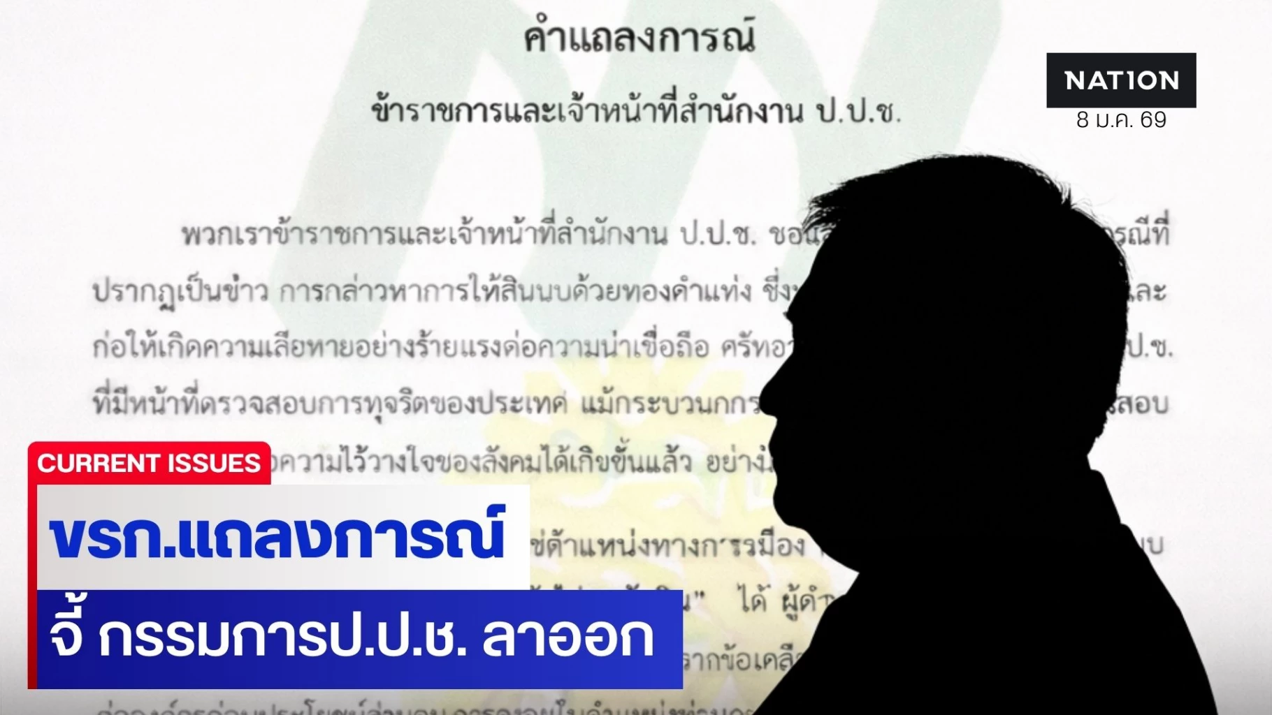 ข้าราชการ - เจ้าหน้าที่ป.ป.ช. ออกแถลงการณ์ จี้กรรมการป.ป.ช. ที่ถูกกล่าวหามีส่วนรับสินบนทองคำลาออก เพื่อปกป้ององค์กร รักษาศรัทธาของประชาชน