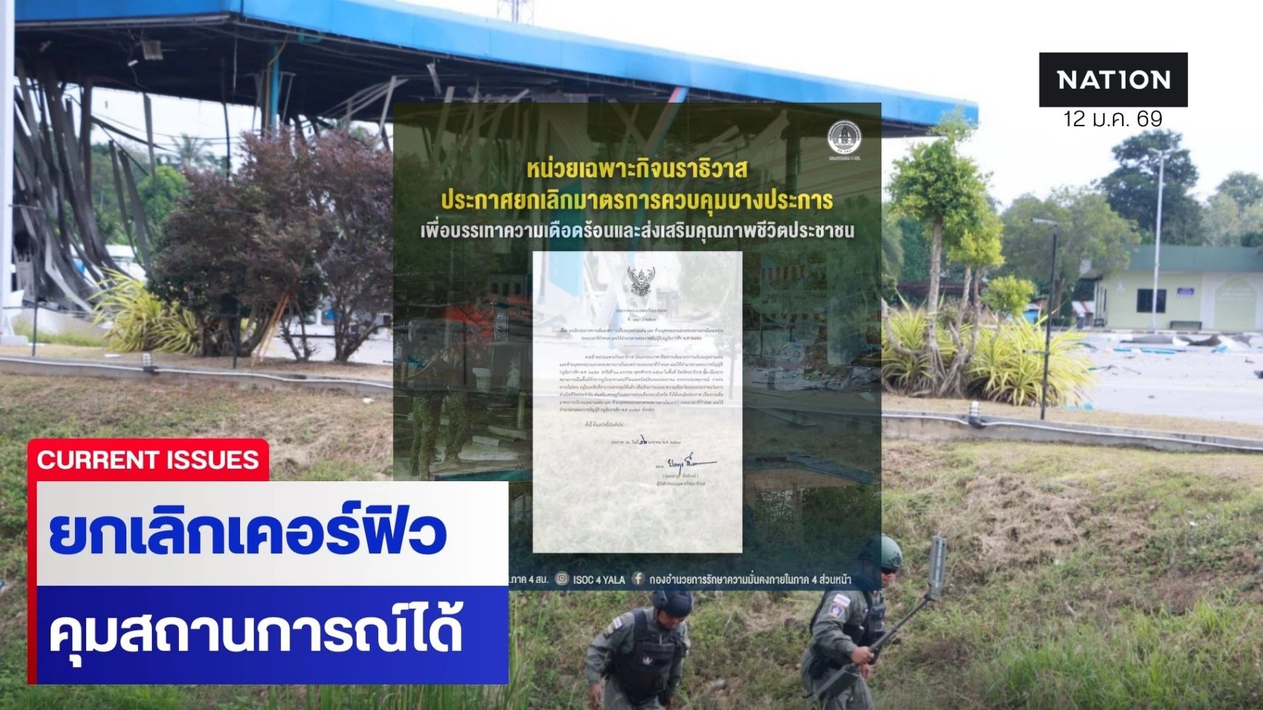 ล่าสุดวันนี้ (12 ม.ค.2569) หน่วยเฉพาะกิจนราธิวาส ขอแจ้งให้ประชาชนทราบว่า จากการประเมินสถานการณ์ความมั่นคงในพื้นที่จังหวัดนราธิวาสในปัจจุบัน พบว่าอยู่ในระดับที่สามารถควบคุมได้ ส่งผลให้ภาพรวมของสถานการณ์มีแนวโน้มดีขึ้นอย่างต่อเนื่อง