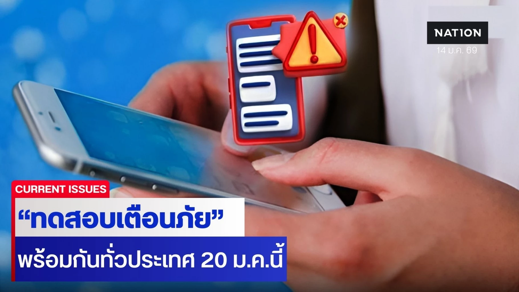14 มกราคม 2569 กรมป้องกันและบรรเทาสาธารณภัย (ปภ.) เตรียมทดสอบการแจ้งเตือนภัยผ่านโทรศัพท์เคลื่อนที่ ผ่านระบบ Cell Broadcast ระดับประเทศ
