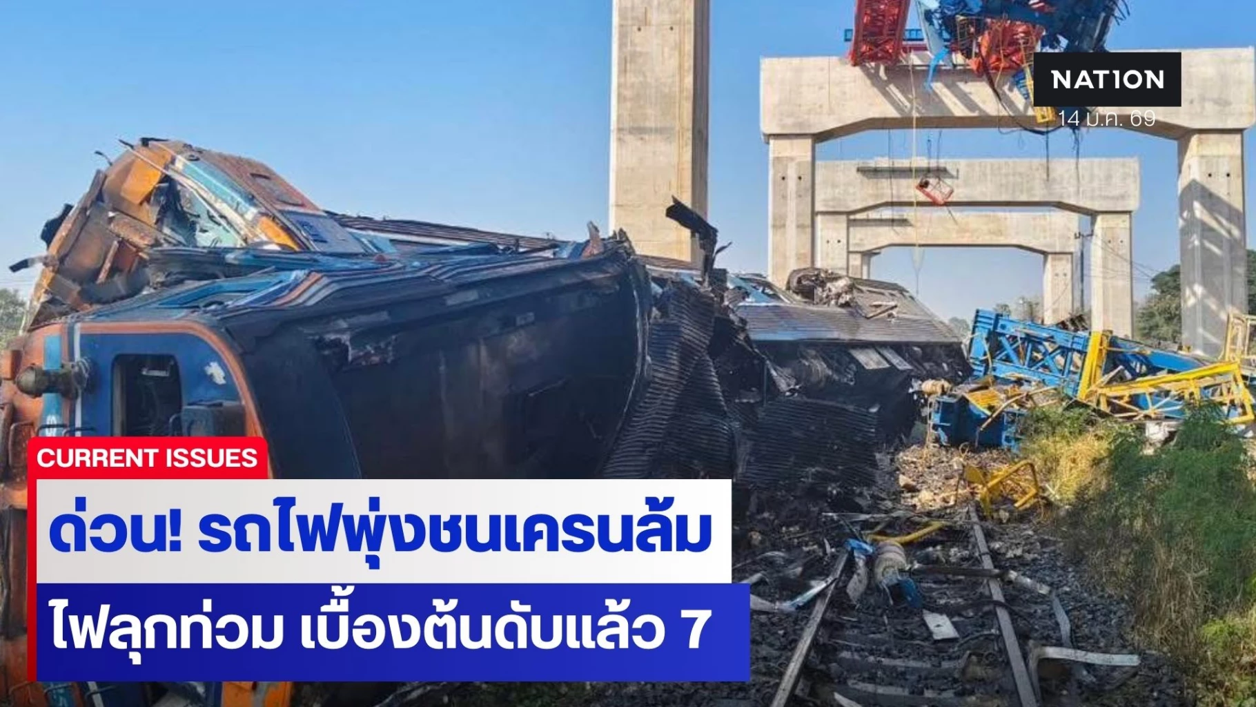 ด่วน! เครนล้มขวางรถไฟ พุ่งชนไฟท่วม เบื้องต้นดับ 7 ติดในซากหลายราย
