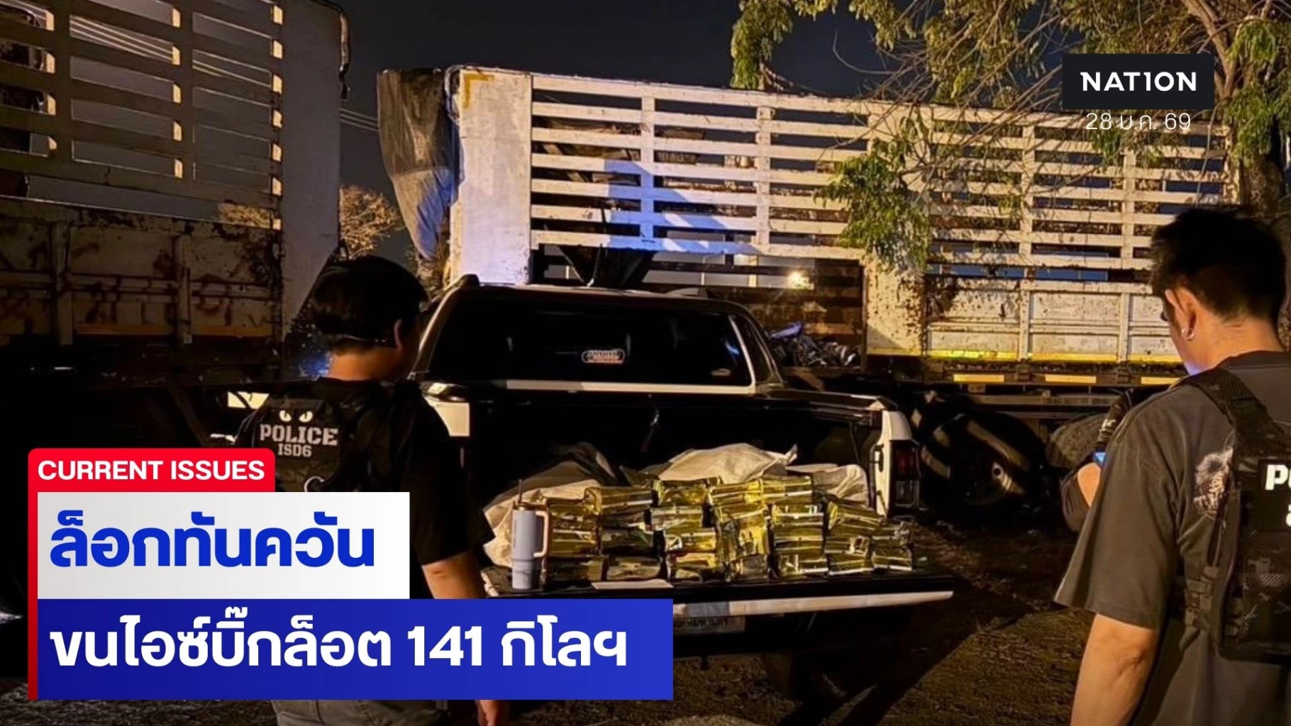 สืบนครบาล 6 ซุ่มล็อกเป้าหมายกลางดึก หลังได้รับแจ้งเบาะแสจะมีการขนยาไอซ์บิ๊กล็อตมาส่งมอบ ผงะ! มีรถพ่วงมาส่งให้รถกระบะ ยึดได้ถึง 141 กิโลกรัม
